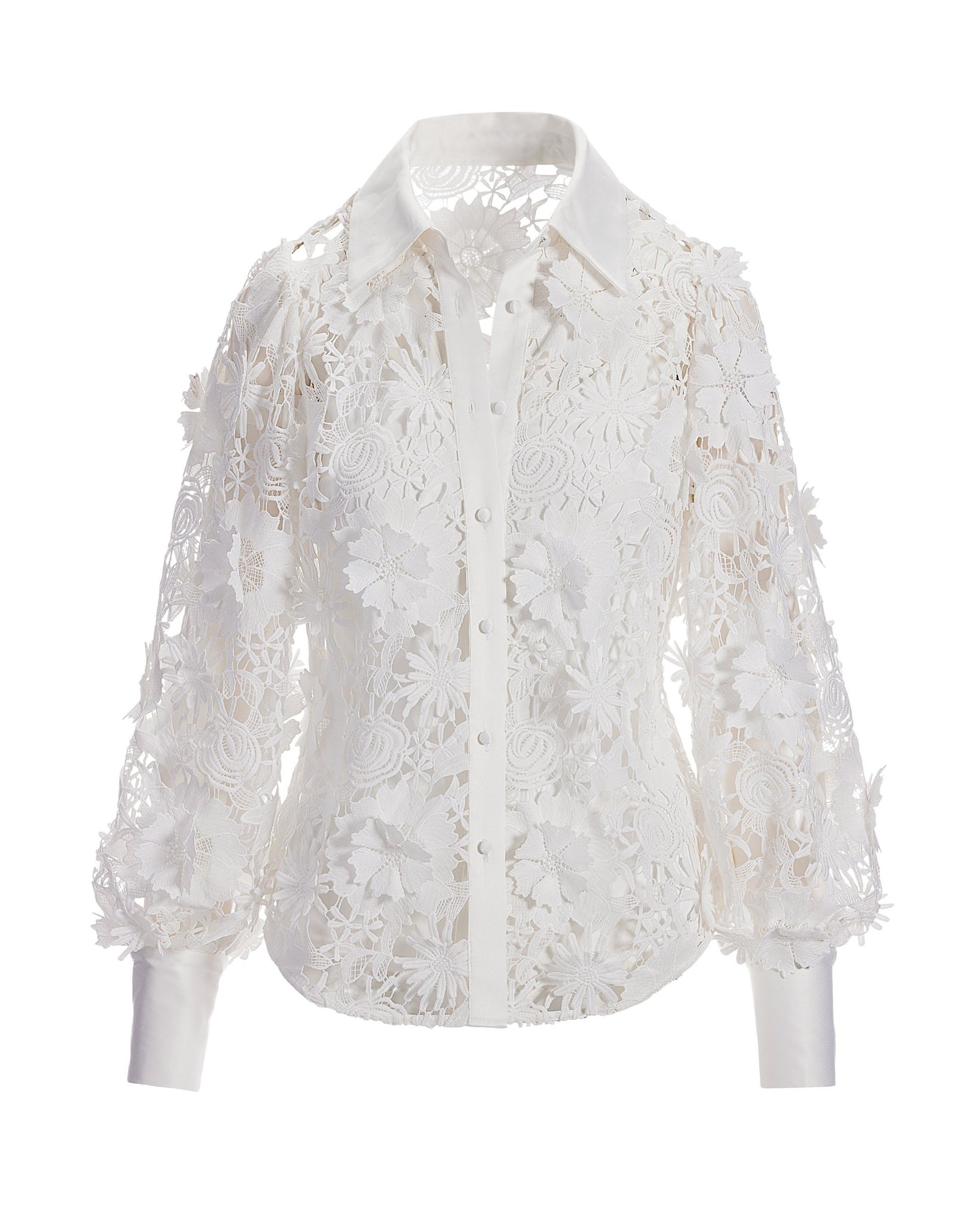 3D Floral Lace Victoria Chic Drama-Sleeve Shirt White