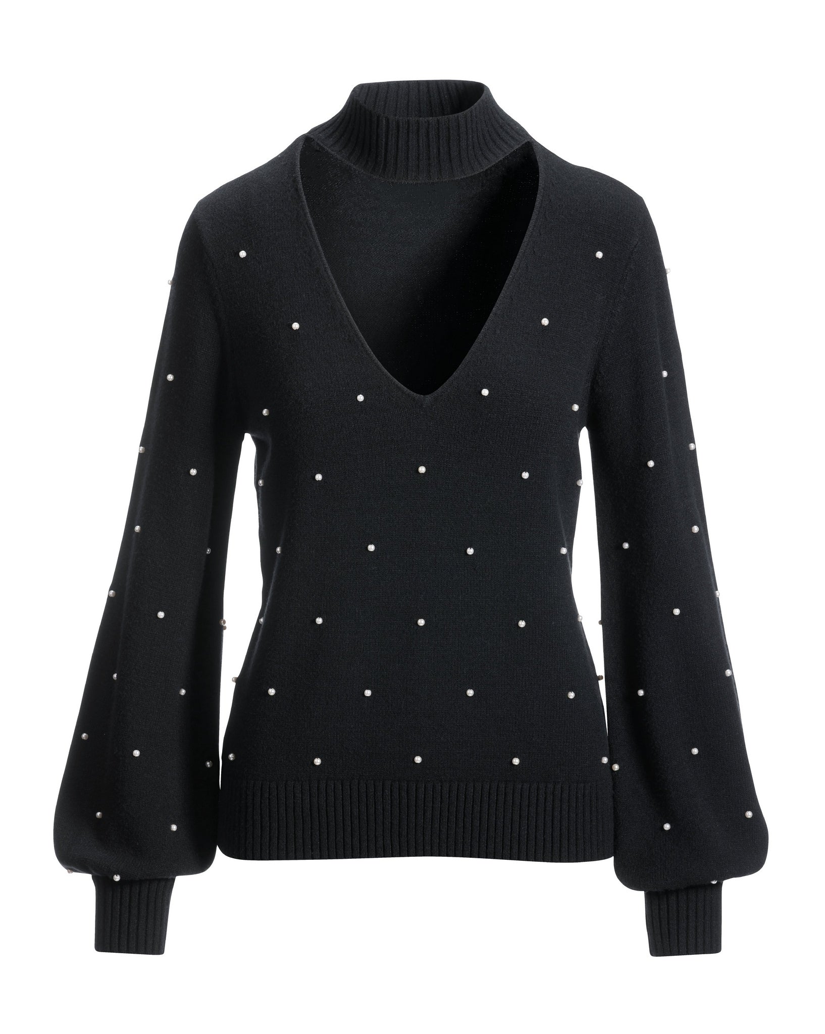 Effortlessly elegant, this V-neck pullover sweater features exquisite pearl embellishment and a captivating mock-neck keyhole design. Stay cozy while making a statement. Perfect for any occasion.