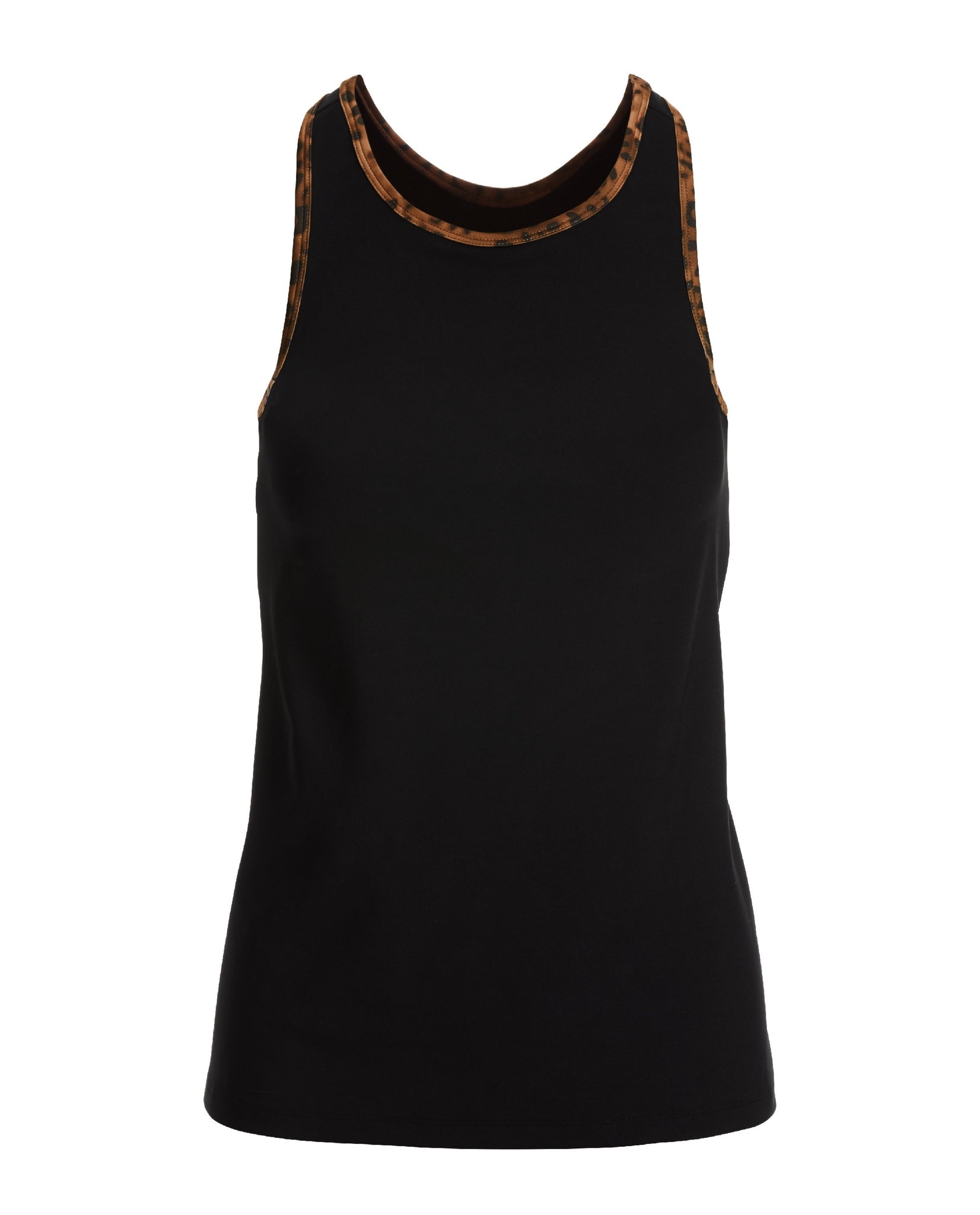 Exotic leopard print trim adds contrast and on-trend fashion detail to this sporty B-Active animal trim tank top. Designed to keep your on-the-go style on the right track, this look is cut from a soft-spun, four-way stretch fabric to take you from yoga class to coffee stops with ease and comfort. Pairs perfectly with our coordinating B-Active jackets and bottoms from the collection, but especially with our equally exotic B-Active animal high-waisted legging and B-Active animal jacket.