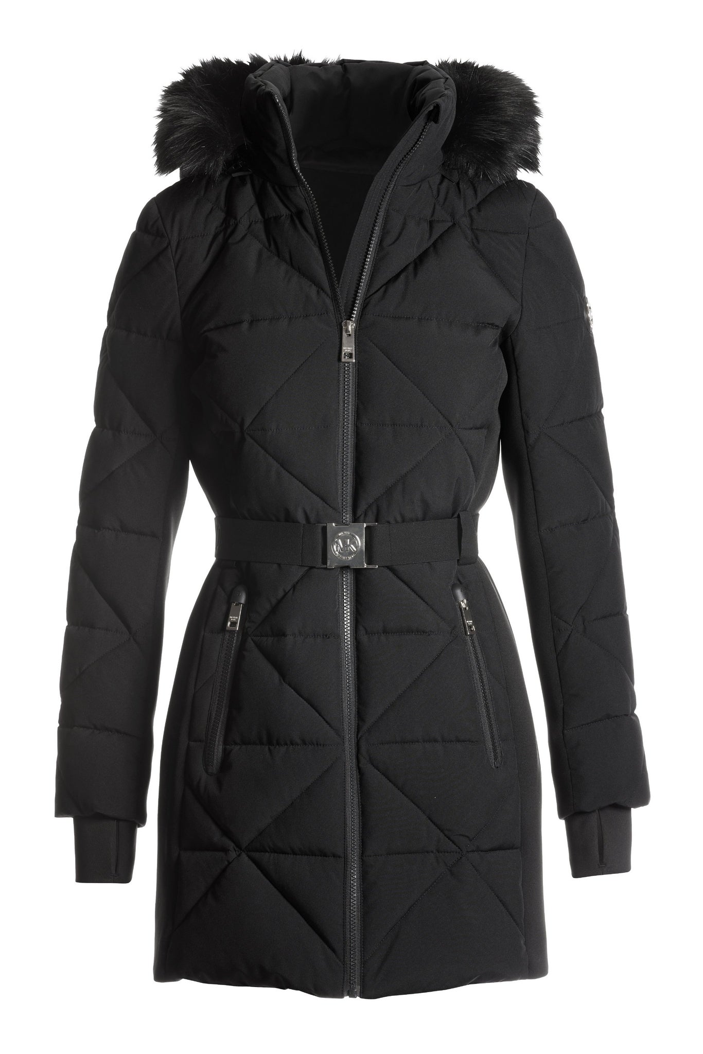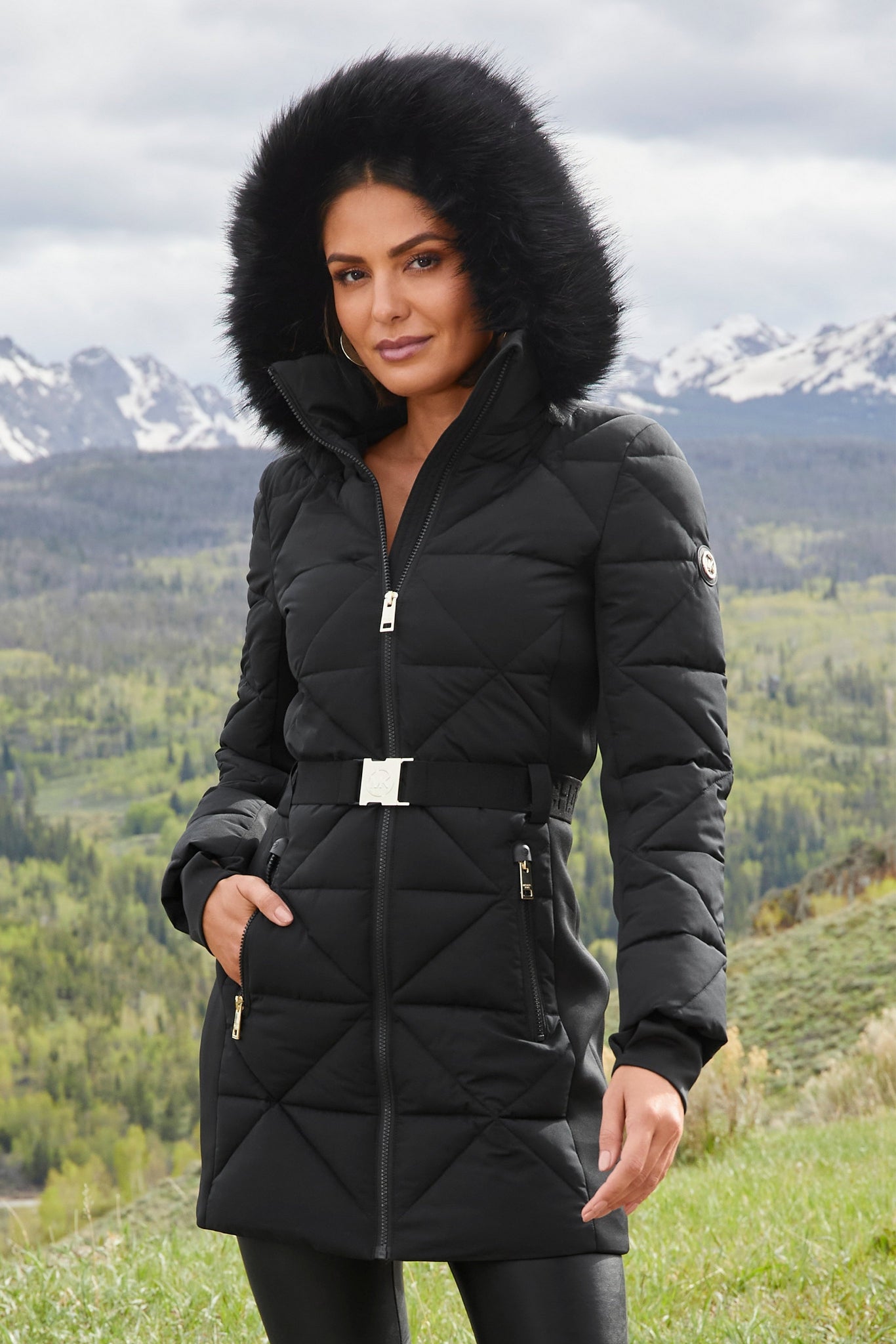 This super-sleek puffer exudes chic style while providing cozy warmth. Quilt stitching, gold branded hardware, and luxe trims offer a sophisticated look around town with wind-blocking details like thumbhole cuffs, a clip-closure belt, and fur-trimmed hood. It's the season's must-have winter jacket that won't leave you out in the cold.