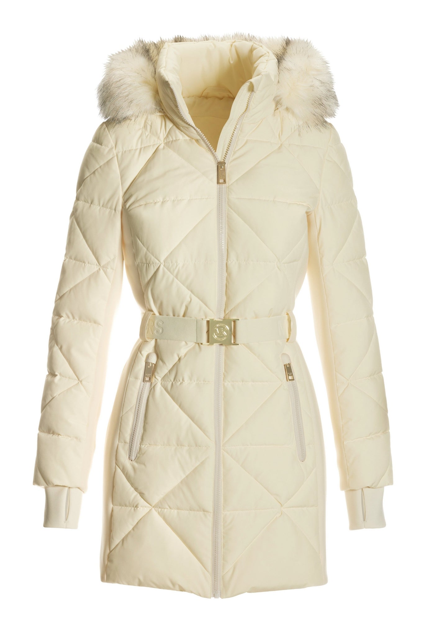 This super-sleek puffer exudes chic style while providing cozy warmth. Quilt stitching, gold branded hardware, and luxe trims offer a sophisticated look around town with wind-blocking details like thumbhole cuffs, a clip-closure belt, and fur-trimmed hood. It's the season's must-have winter jacket that won't leave you out in the cold.