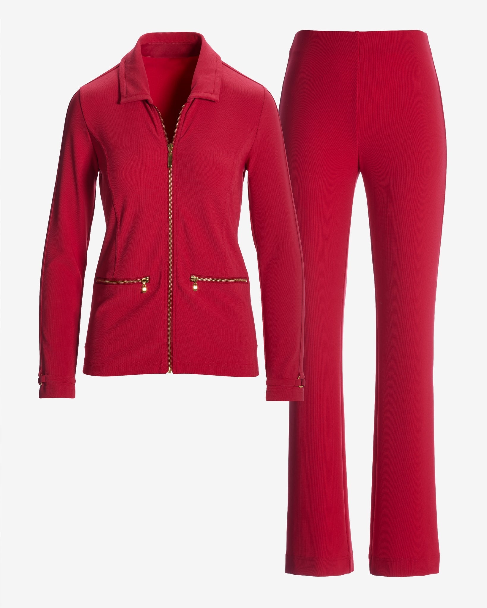 Our Beyond Travel Collared Sport Set features a pointed-collar jacket with front zip closure and zip waist pockets, paired to an easy, pull-on pant. It’s made with our exclusive double-knit, four-way stretch fabric that’s wrinkle-resistant for polished comfort anywhere and everywhere. Build your wardrobe with other Beyond Travel pieces to create versatile day-to-night looks.