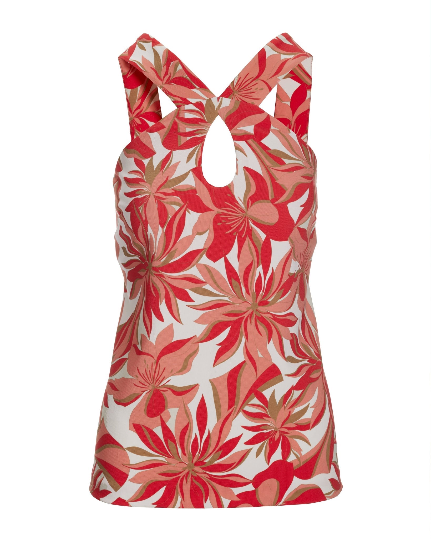 Beyond Travel Paradise Blooms Print Keyhole Tunic Top Pink Paradise/Light Camel