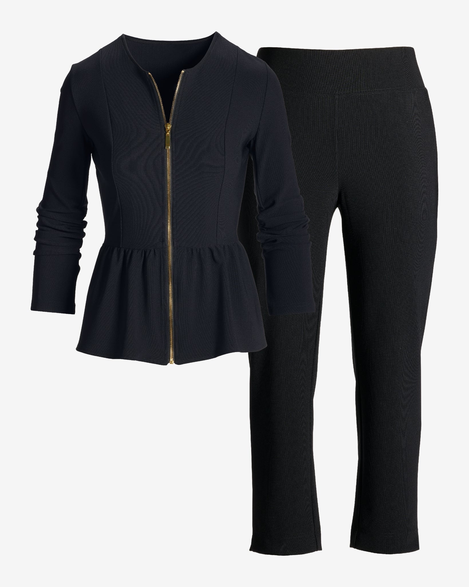 Designed to go wherever your schedule takes you, the Beyond Travel Peplum Coordinates blend comfort with sharp sophistication. The zip-front peplum jacket defines the waist for a flattering silhouette, while the sleek ankle pants finish the look with modern polish. Whether styled together or worn separately, this set is ready to elevate your routine.