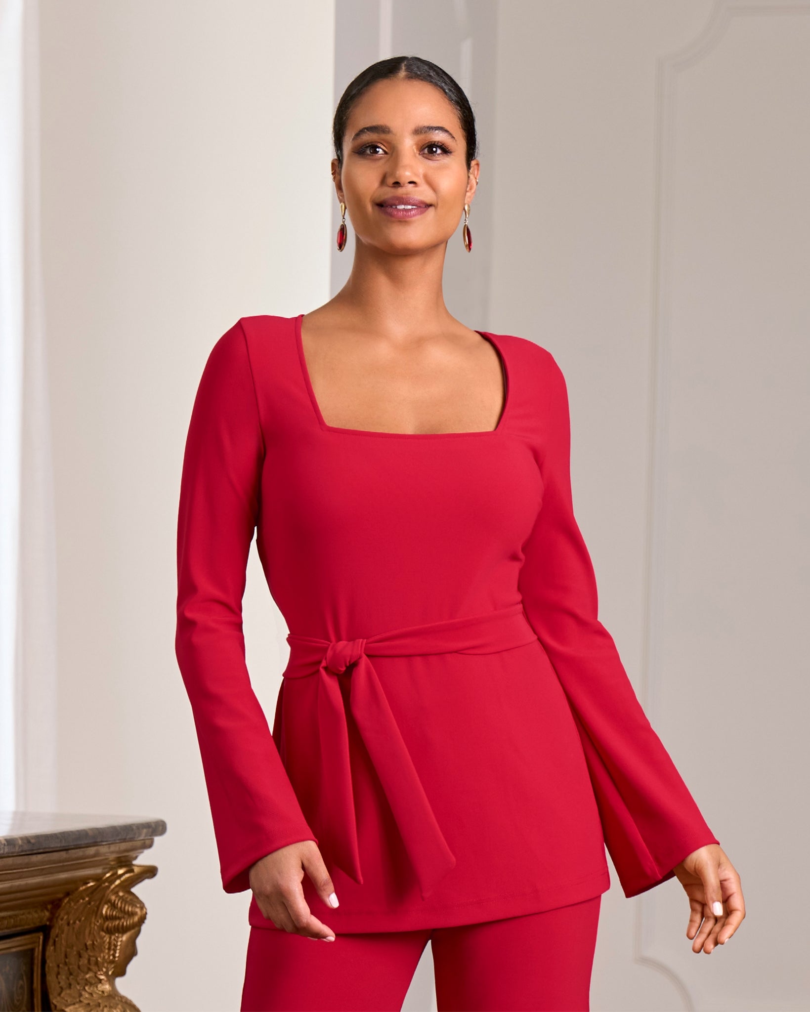 Our Beyond Travel Square Neck Tie Waist Top features a square neckline, long sleeves, and a self-tie belt. It’s made with our exclusive double-knit, four-way stretch fabric that’s wrinkle-resistant for polished comfort anywhere and everywhere. Build your wardrobe with other Beyond Travel pieces to create versatile day-to-night looks.