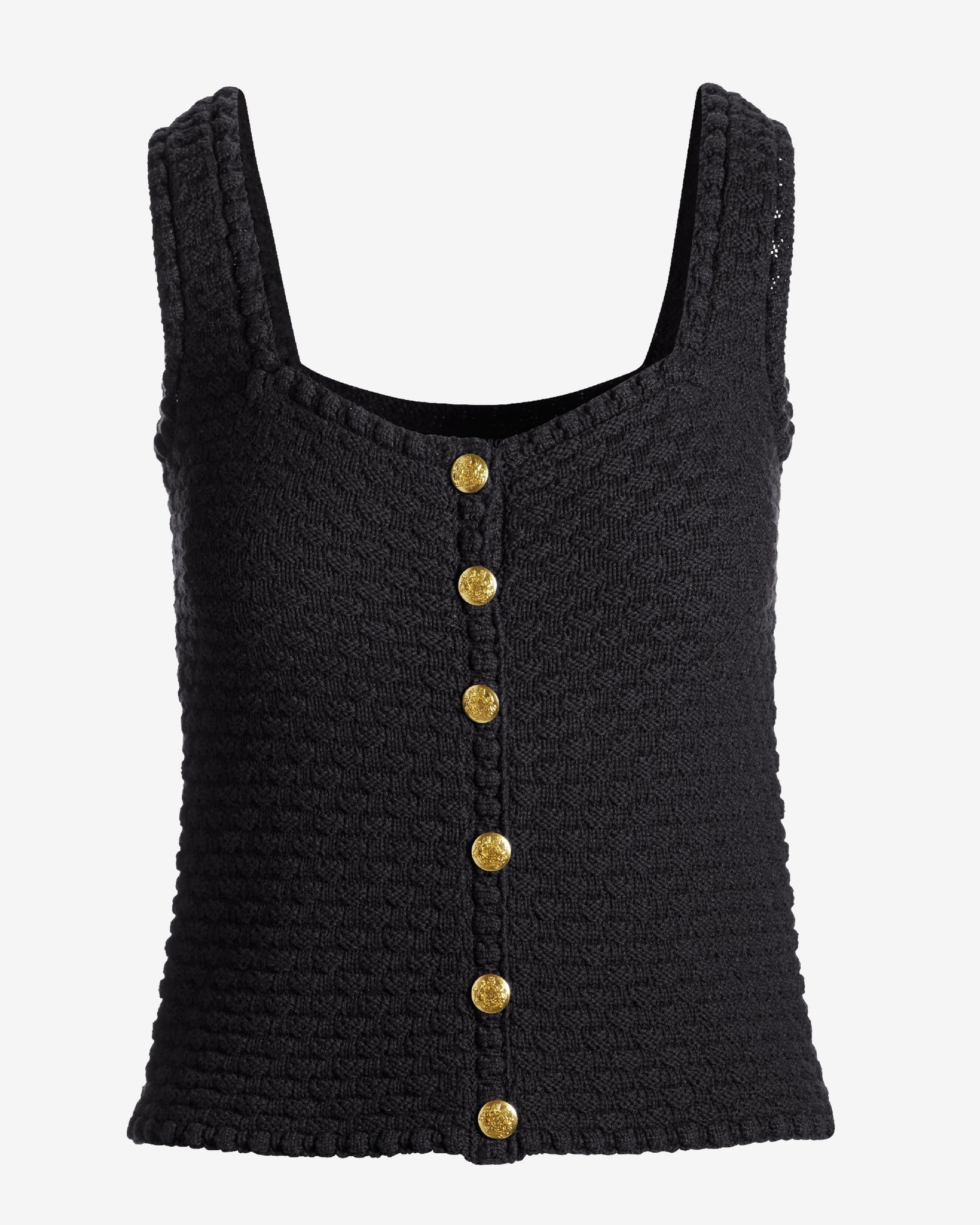 Sophisticated on its own or layered under the matching cardigan, the Button Detail Sweater Tank brings versatility to every outfit. Crafted in a textured cotton knit, this fitted tank features a square neckline and gold-tone buttons down the front for a polished finish. Ribbed crochet trim at the neck and armholes adds a subtle touch of dimension to this wear-everywhere essential.