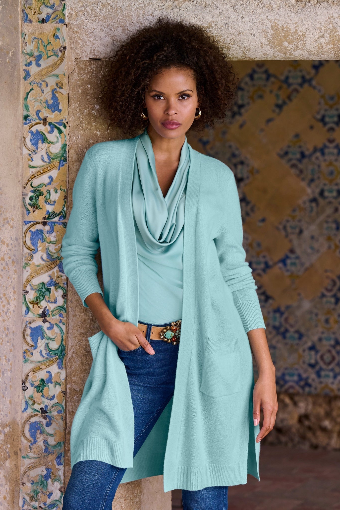 There's just something about the feel of luxe cashmere that makes you want to wrap yourself in it every day, so cover yourself in this long cardigan, designed with an effortless open front, patch waist pockets to keep your hands cozy and a split hem for a comfortable fit.