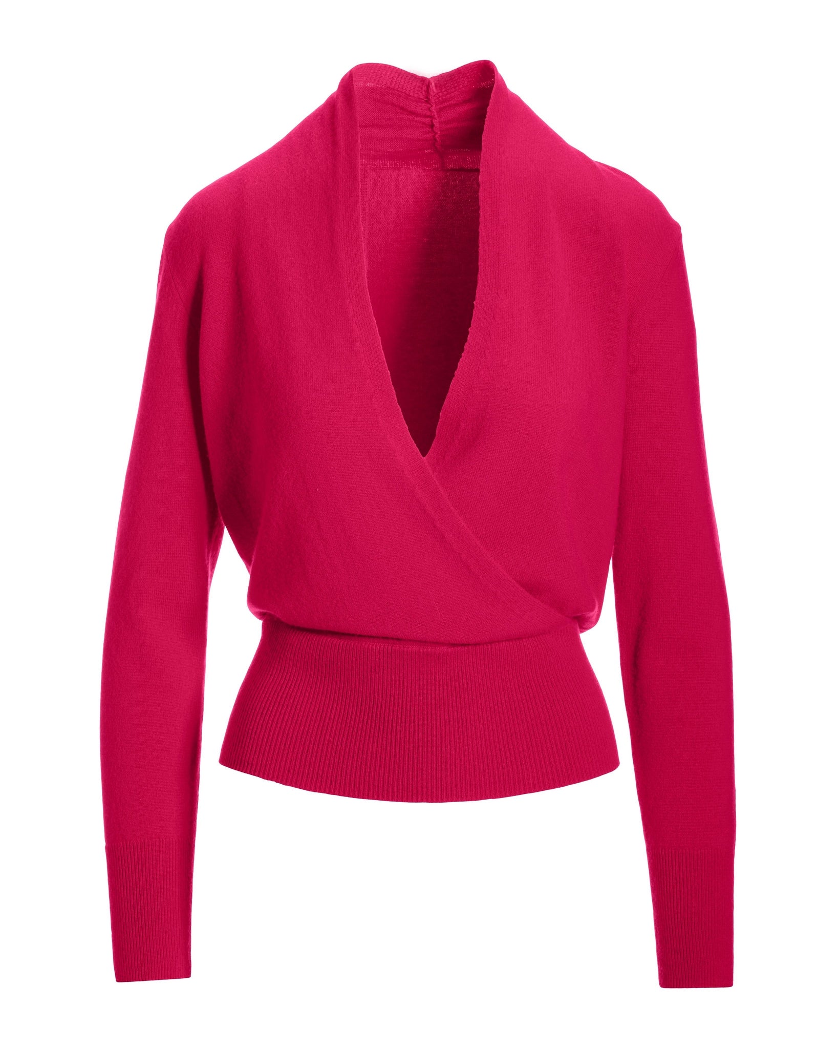 You get the luxurious feel of cashmere in an oh-so-comfortable and flattering surplice blouson silhouette. This sweater will be a wardrobe favorite any day of the week.