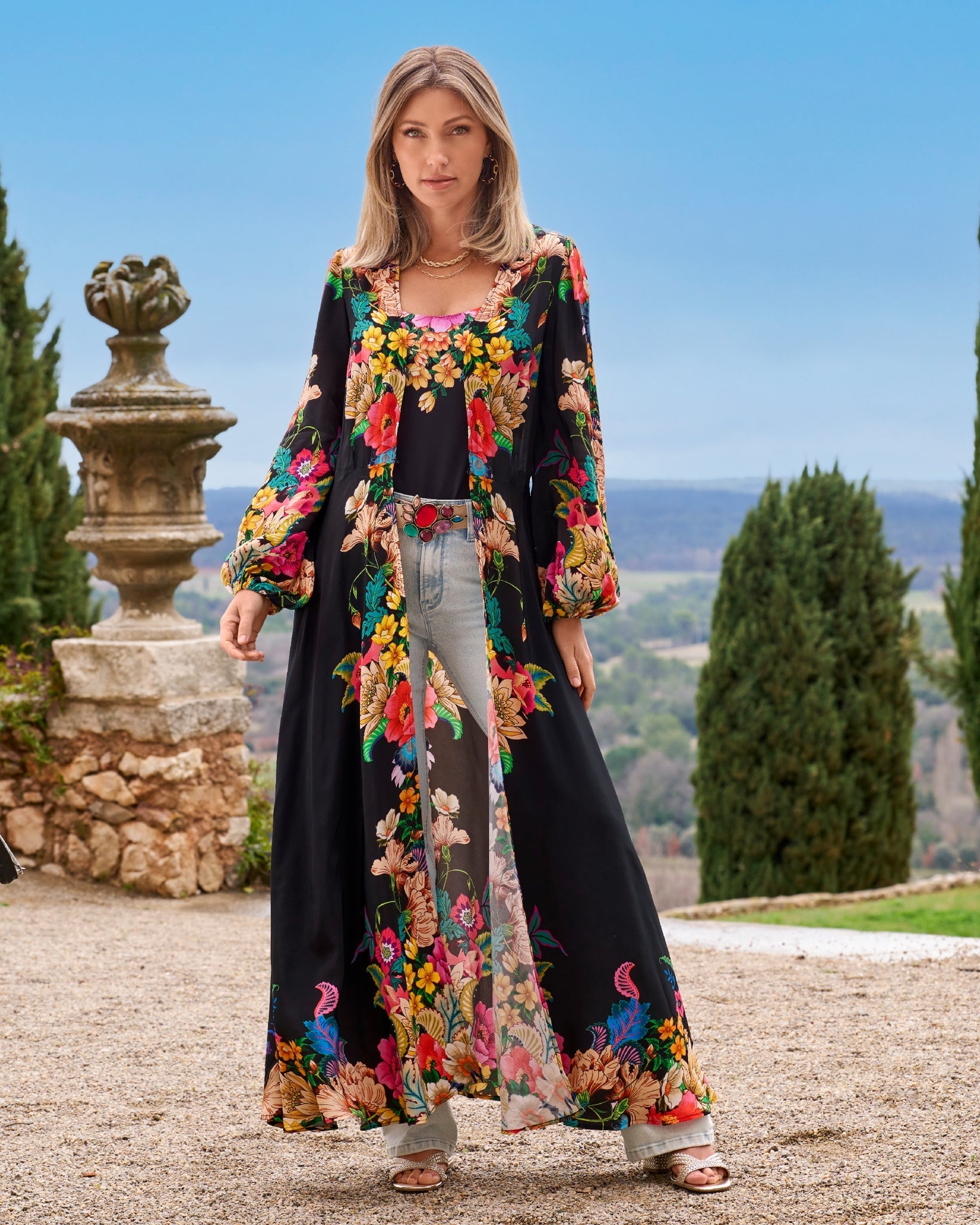 The duster silhouette is a versatile wardrobe staple for layering and adding interest to any outfit. From denim and leather outfits to a little black dress accent, our Castillo Gardens Luxe Full-Length Duster makes a statement in luxe 100% viscose, however styled.