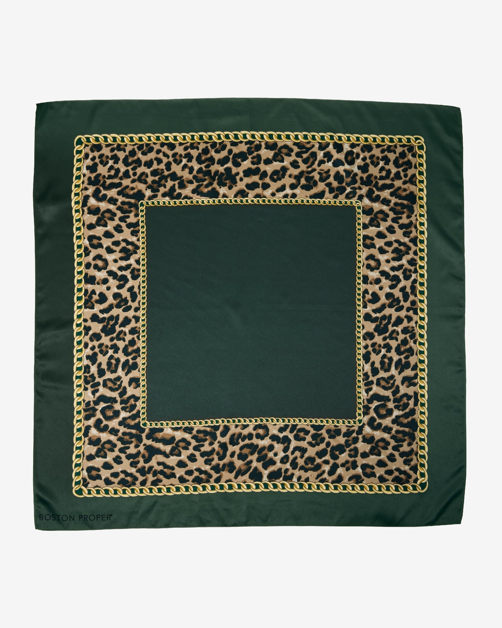 Our limited-edition Chain and Cheetah Scarf embodies the look of luxury with cheetah print, gold chain detail, and brilliant emerald color. Wear it as a head scarf, hair tie, or wrist bracelet, or wrap it around your purse handle for an elevated touch of glamour.