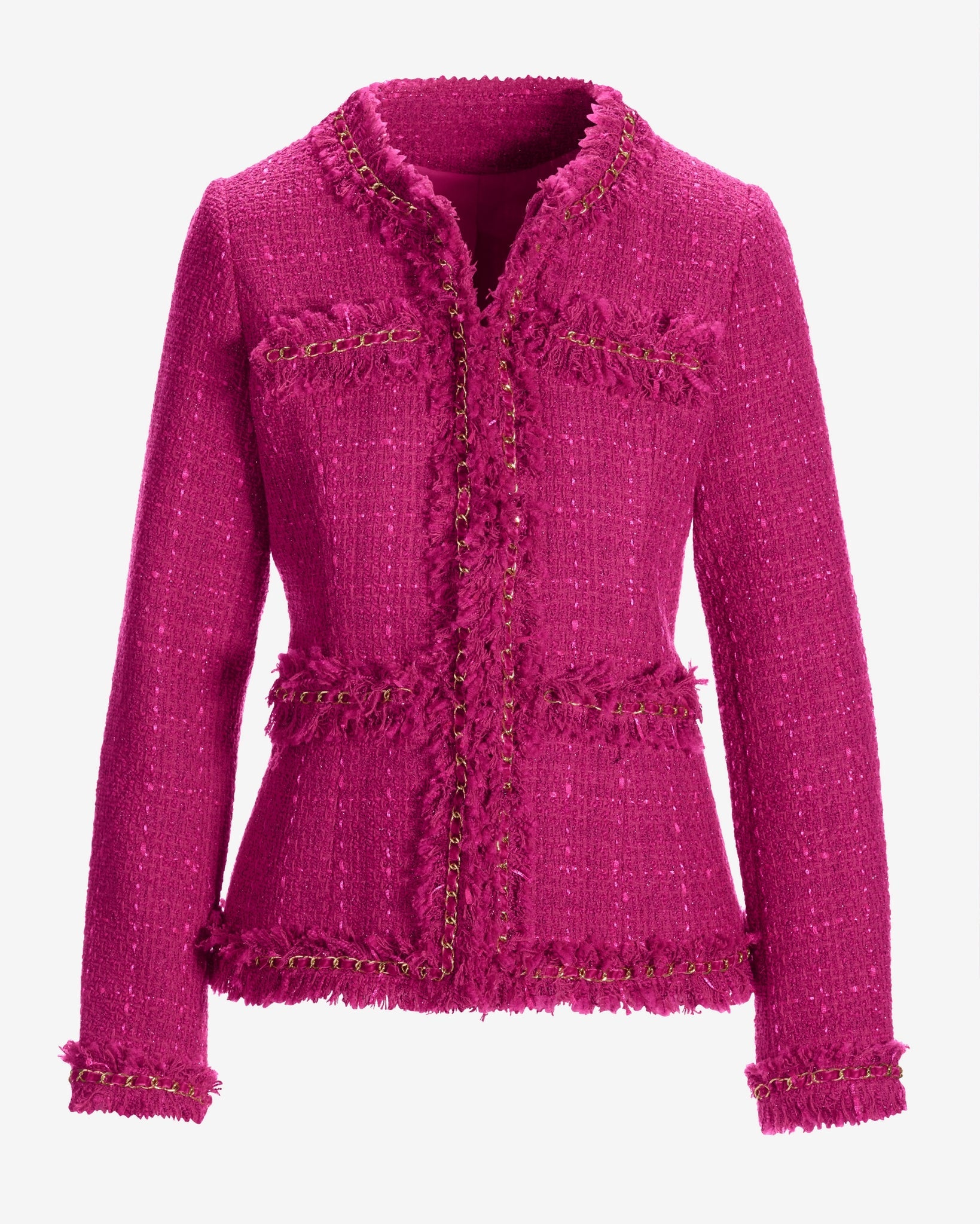 Our Chain Detail Tweed Parisian Jacket brings chic statement style to your layers lineup. Crafted from tweed with metallic threading woven throughout, it’s trimmed with fringe edges plus a velvet and chain detail for a boldly feminine finish.
