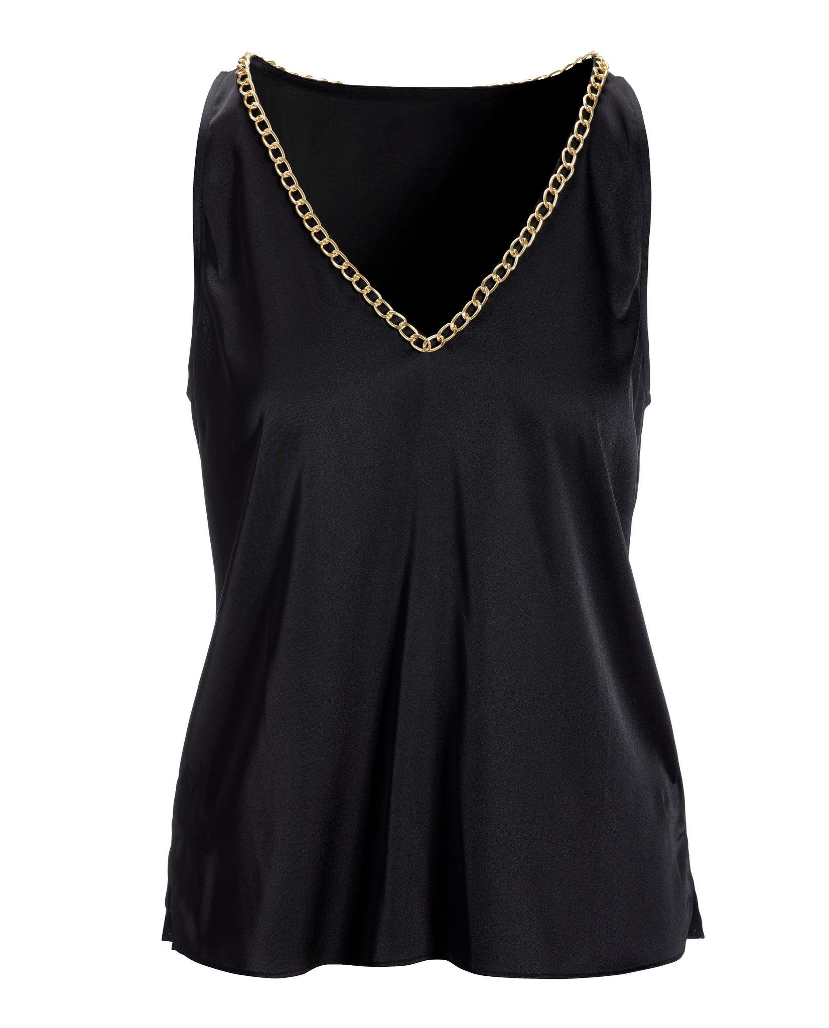Charm's gone glam with polished gold-tone chain detail on a V-neckline and bust darts and side slits that lend a tailored look to this silky blouse.
