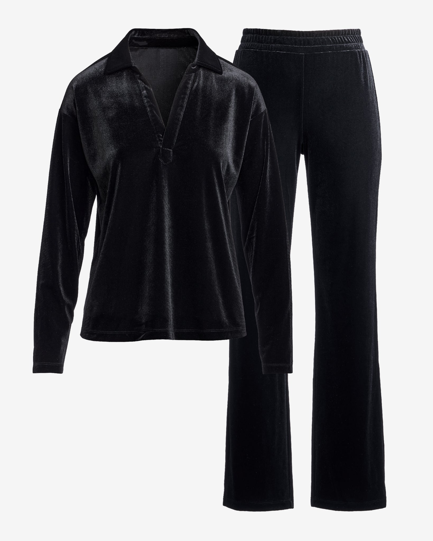 Chic Velour Collared V Neck Wide Leg Pant Set Black