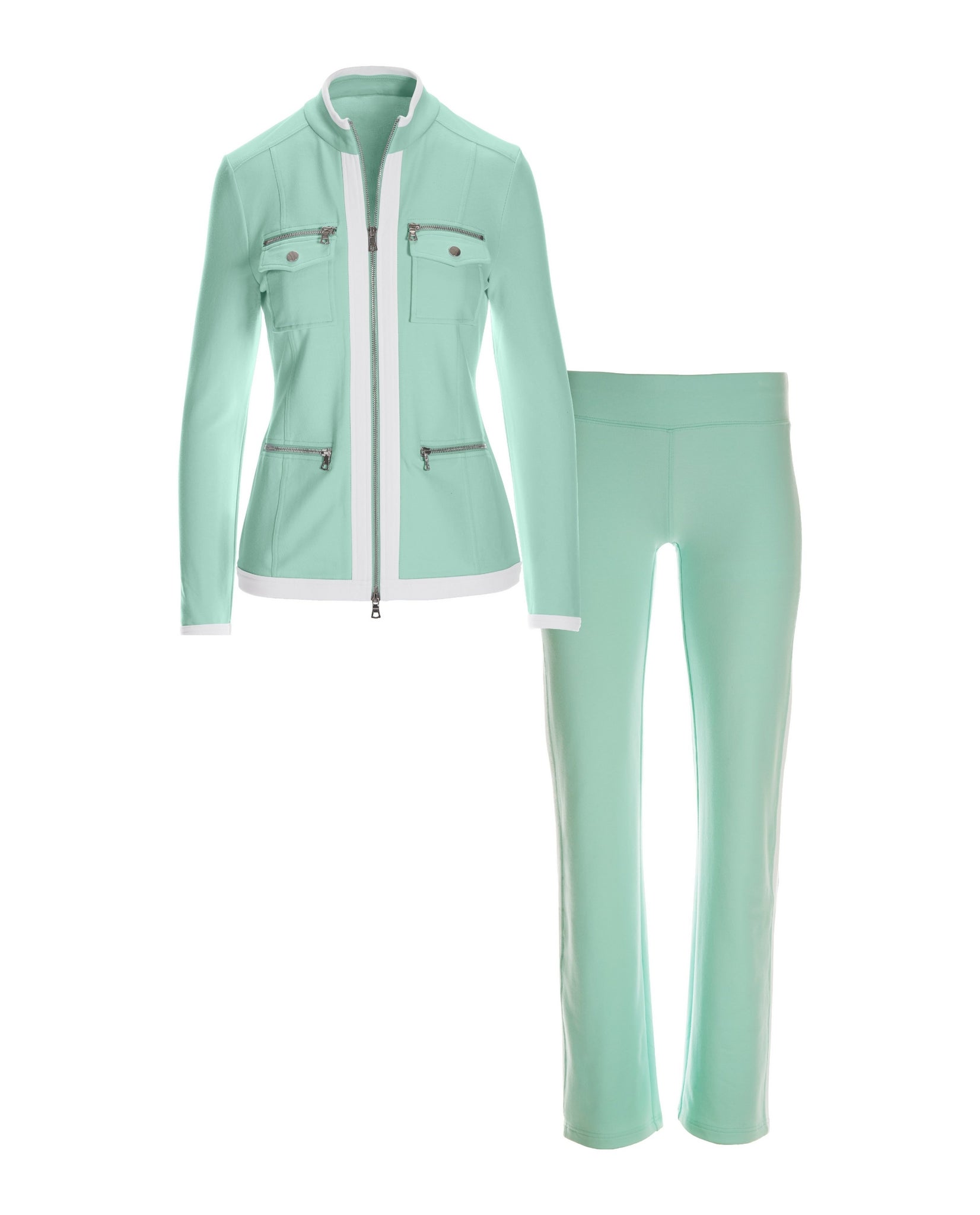 Sophisticated and chic, this sporty warm-up checks all the boxes for effortless style. The plush French terry set includes a comfortable two-way gold-tone zip jacket with zip pockets and an easy pull-on elastic-waist pant for on-the-go and off-duty days.
