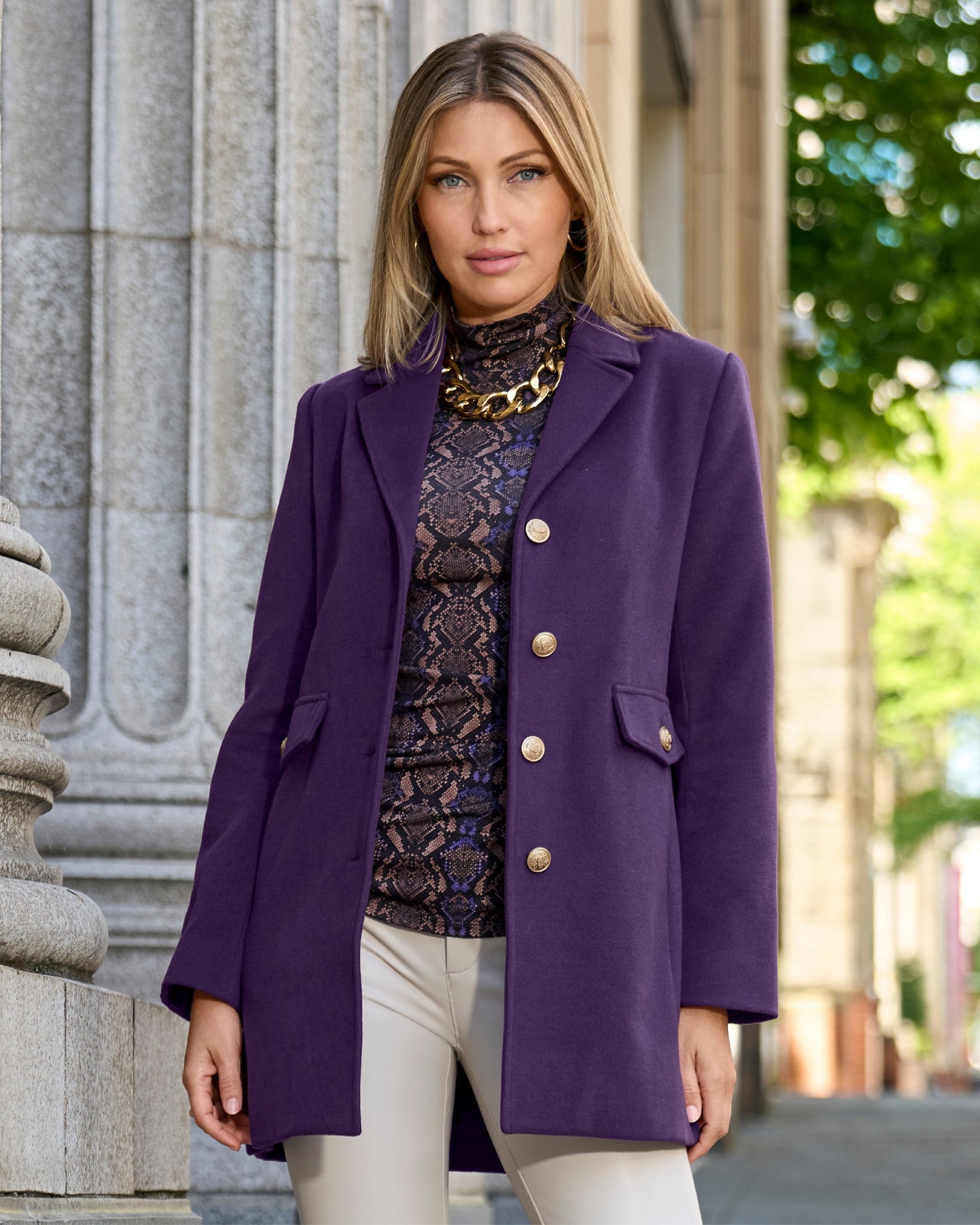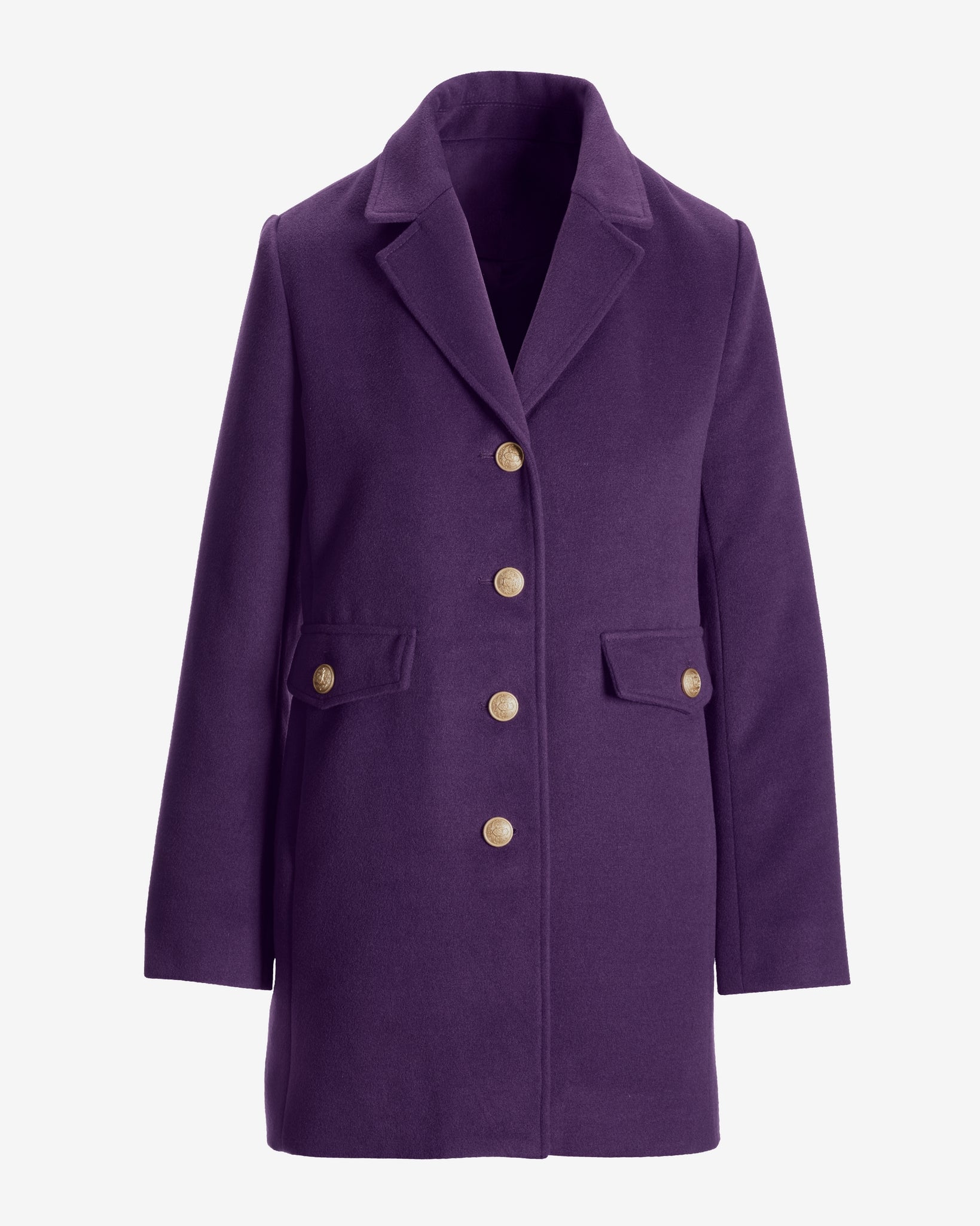 Destined to be a wardrobe favorite for years to come, this classic tailored coat features a comfortable fit and a clean look with gold-tone crested button details.