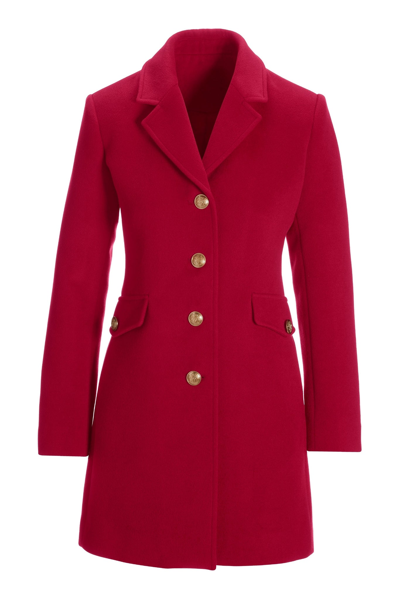 Destined to be a wardrobe favorite for years to come, this classic tailored coat features a comfortable fit and a clean look with gold-tone crested button details.
