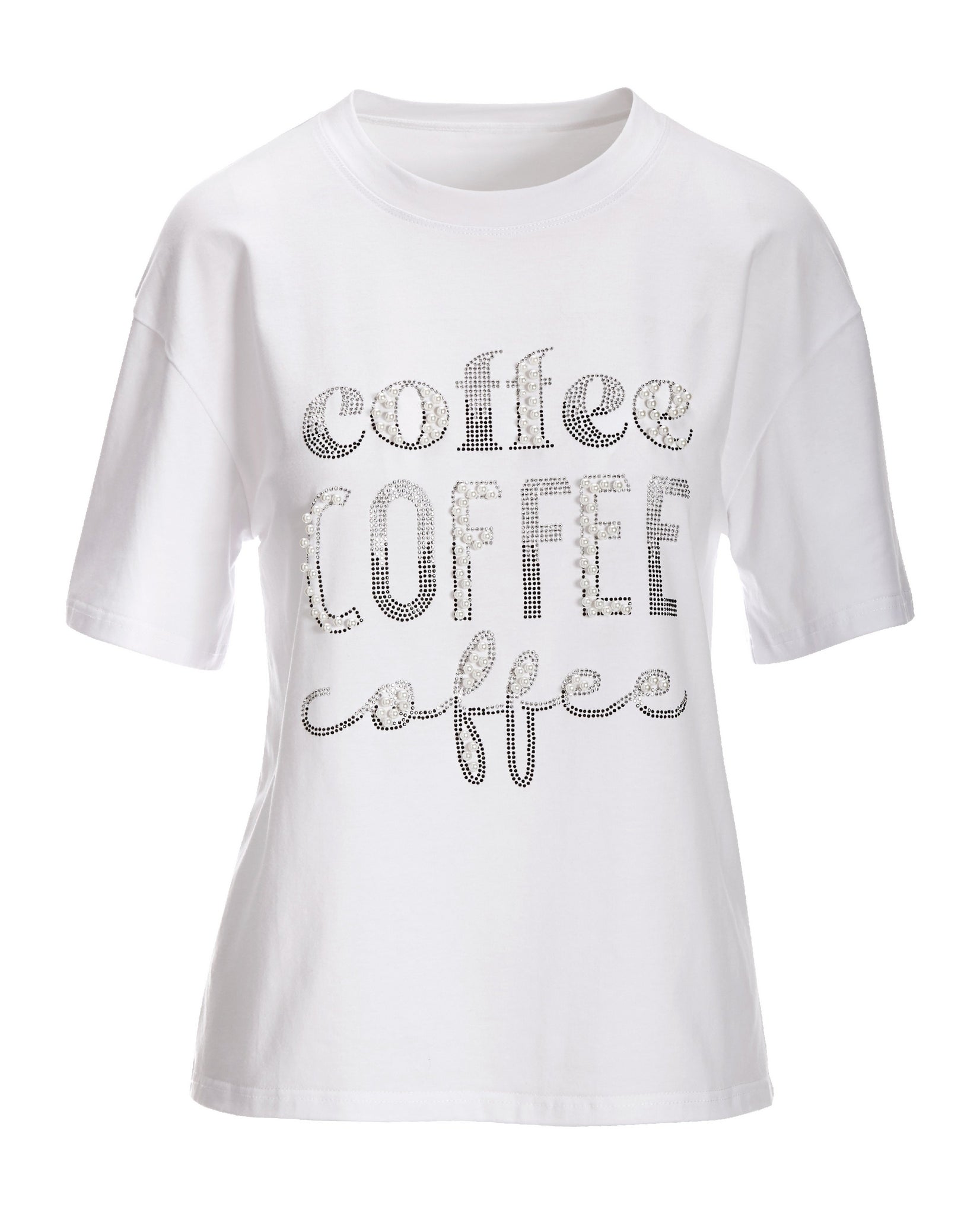 We give you coffee...three ways, topped with bold faux pearl details on a comfortable short-sleeve, cotton-blend graphic tee.