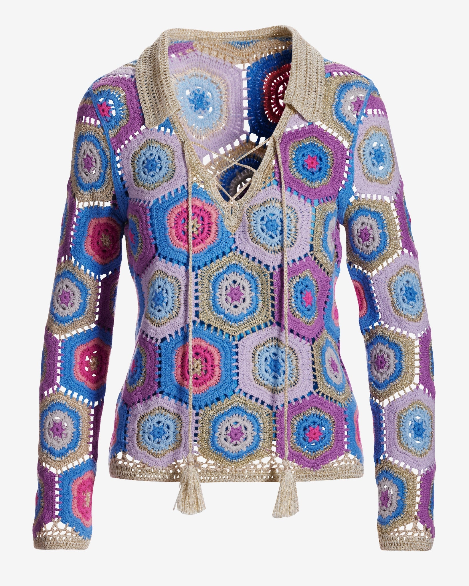 Effortlessly boho-chic, our Collared Crochet Sleeve Sweater features a vibrant multicolor pattern with a subtle metallic sheen. Designed with a collared V-neckline, partial lace-up tie with tassel accents, it pairs beautifully with the included cami for a standout casual look.