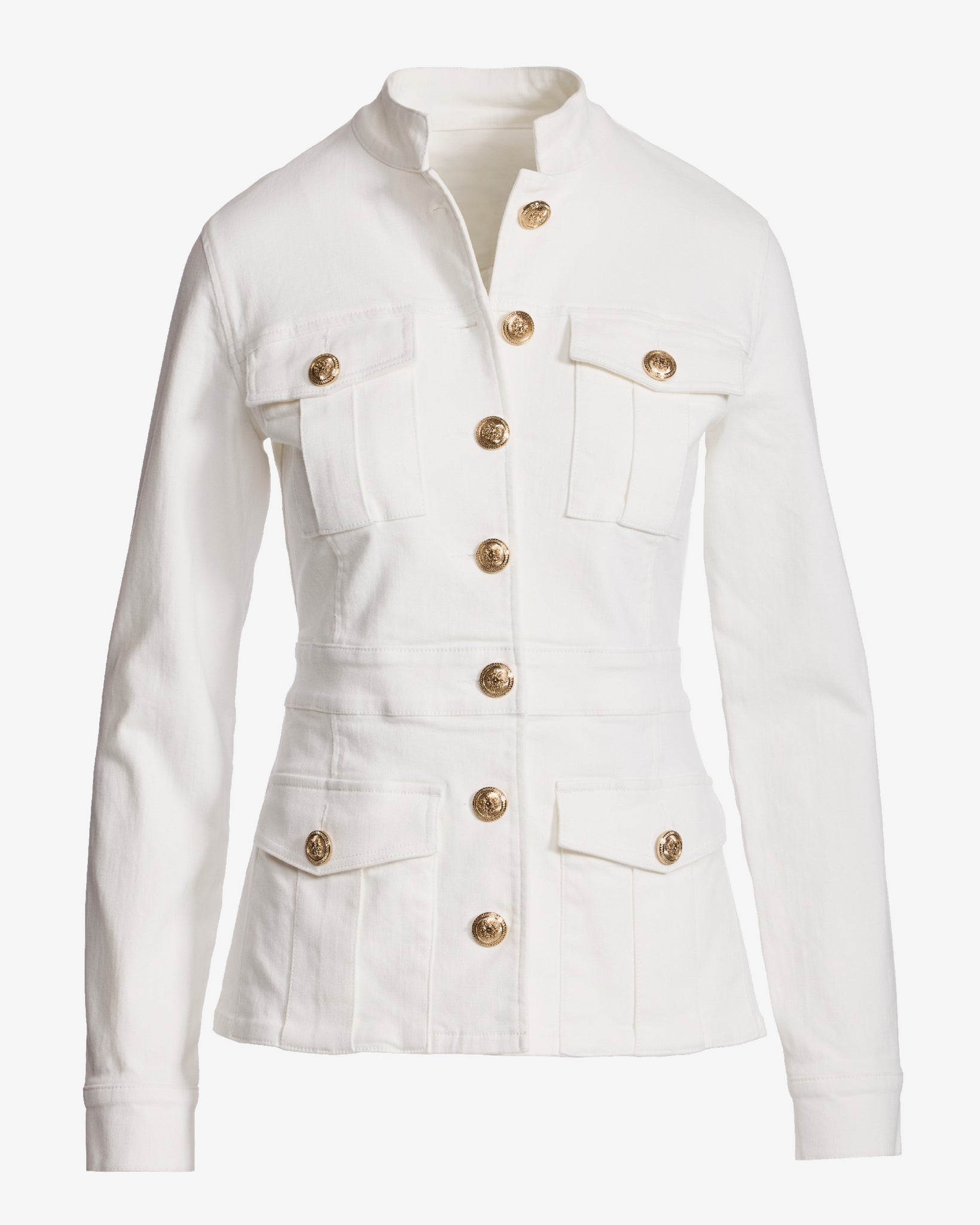 Crest Button Stretch Denim Luxe Utility Jacket Off White