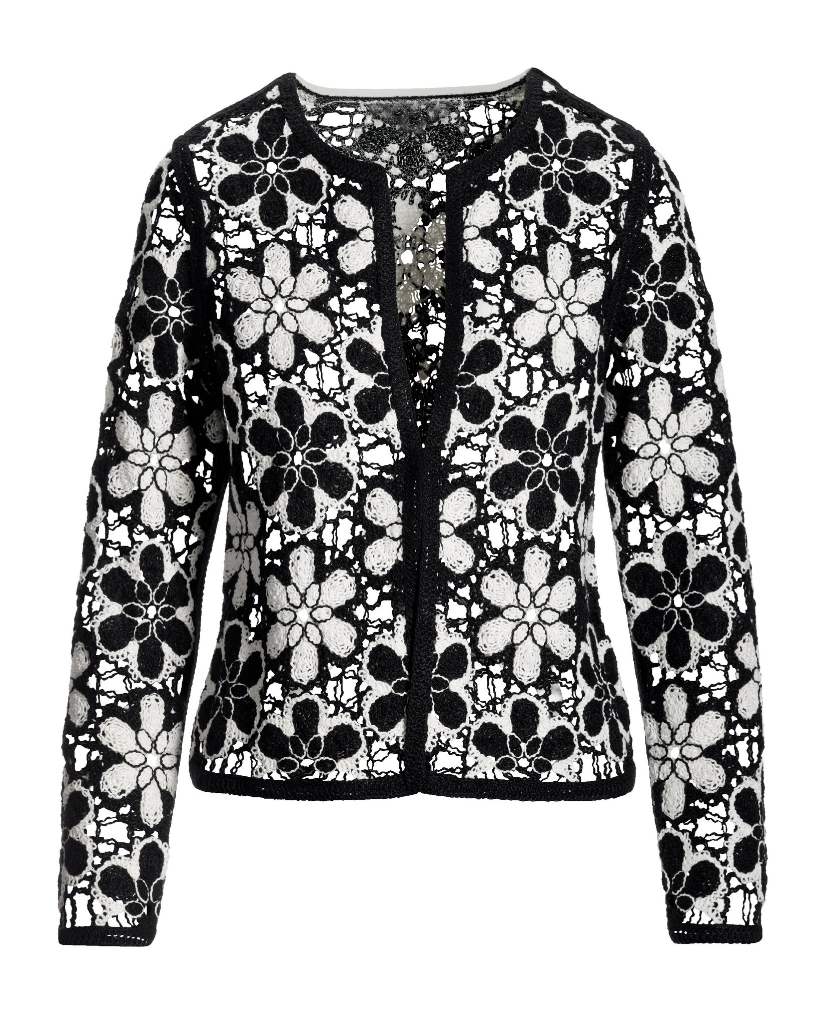 The one-of-a-kind style to top off all your looks. With its chic floral pattern and classic black and white palette, our open-crochet cardigan adds a layer of warmth and interest to your outfits this season and beyond.
