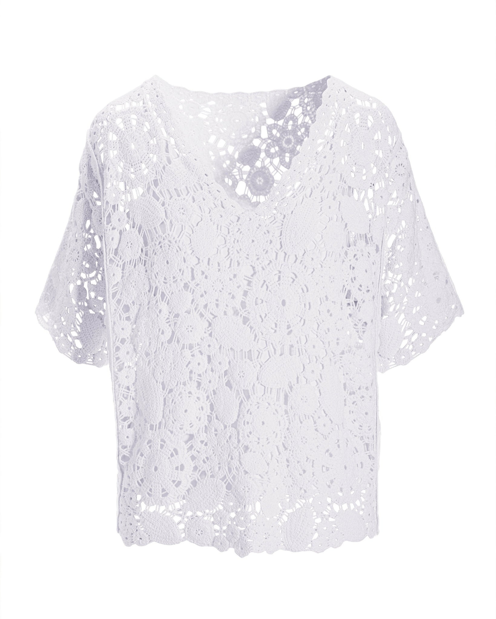 Crochet Effortless V Neck Short Sleeve Sweater White