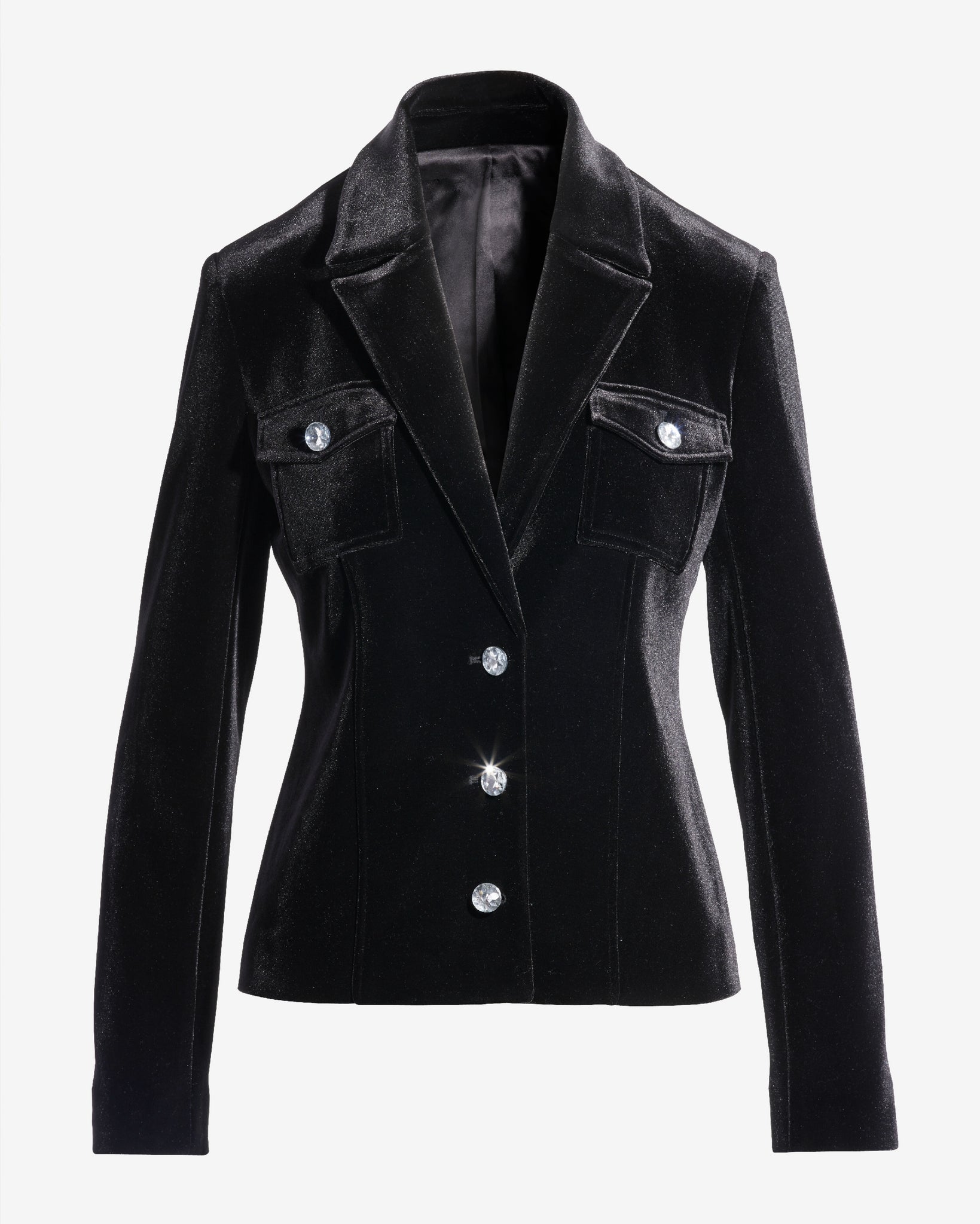 Transform your evening look with our Crystal Button Velvet Jacket, crafted from plush stretch velvet for a luxurious fit and feel. With its notched lapel, gleaming crystal buttons, and tailored silhouette, you’ll make an impression wherever you go.