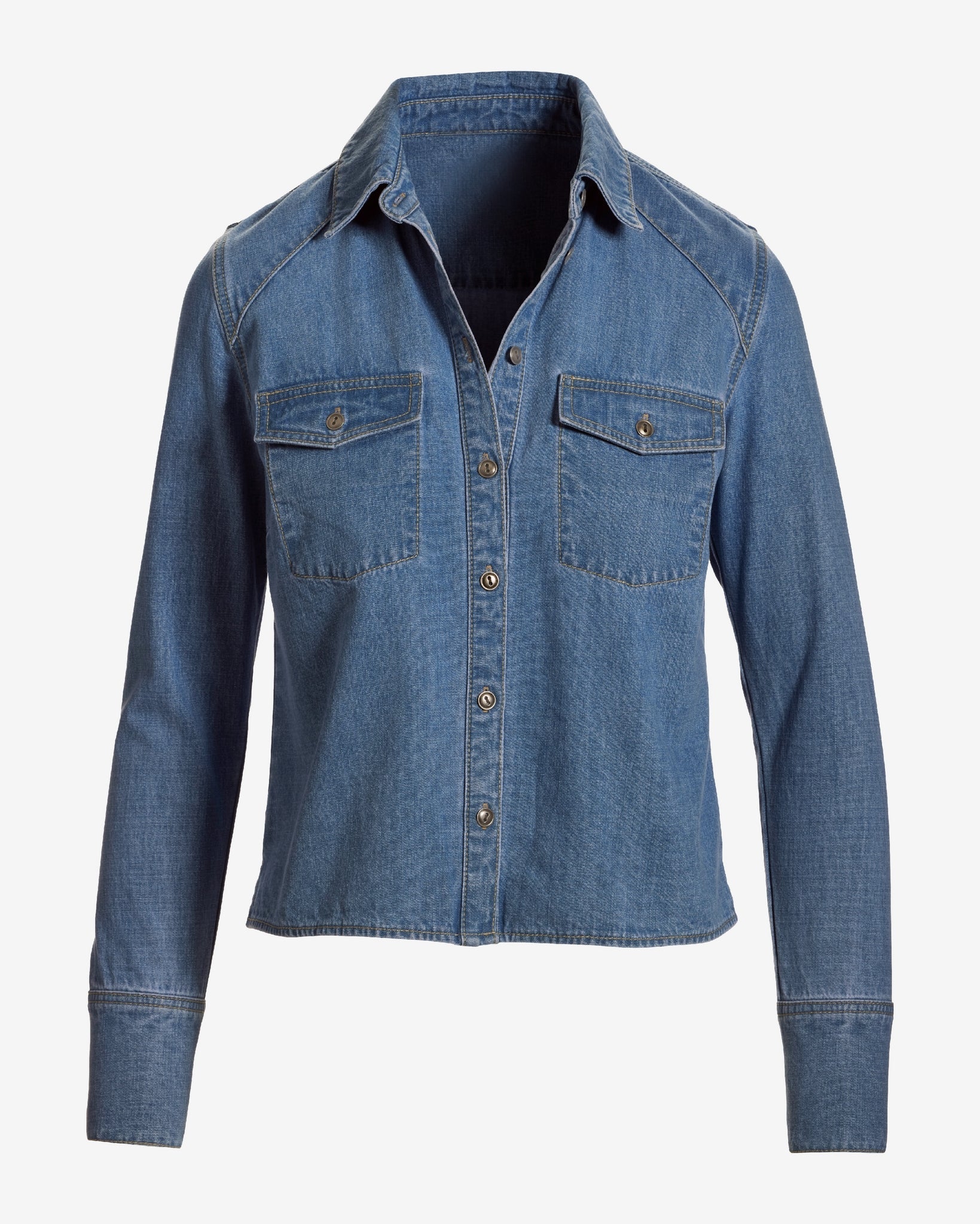 This lightweight denim shirt features a cropped hem and long sleeves for a modern, laid‑back vibe. Pointed chest pockets and extended cuffs add subtle detail, while the classic collar keeps it polished. Wear it buttoned up with high‑rise trousers or open over a tee for effortless cool.