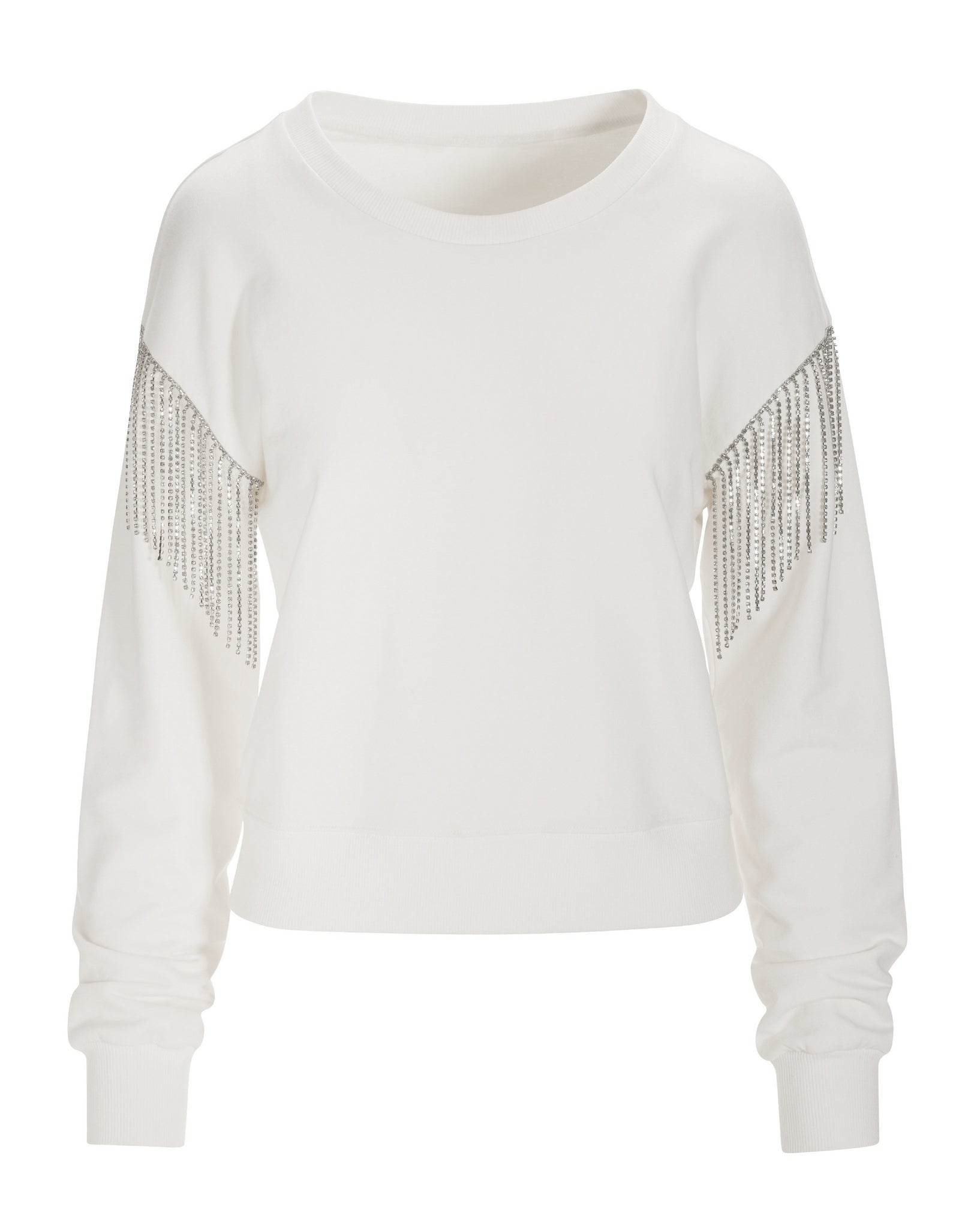 Combining comfort and glamour, this sweatshirt features sparkling embellishment and playful fringe, adding a touch of sophistication to your casual looks.