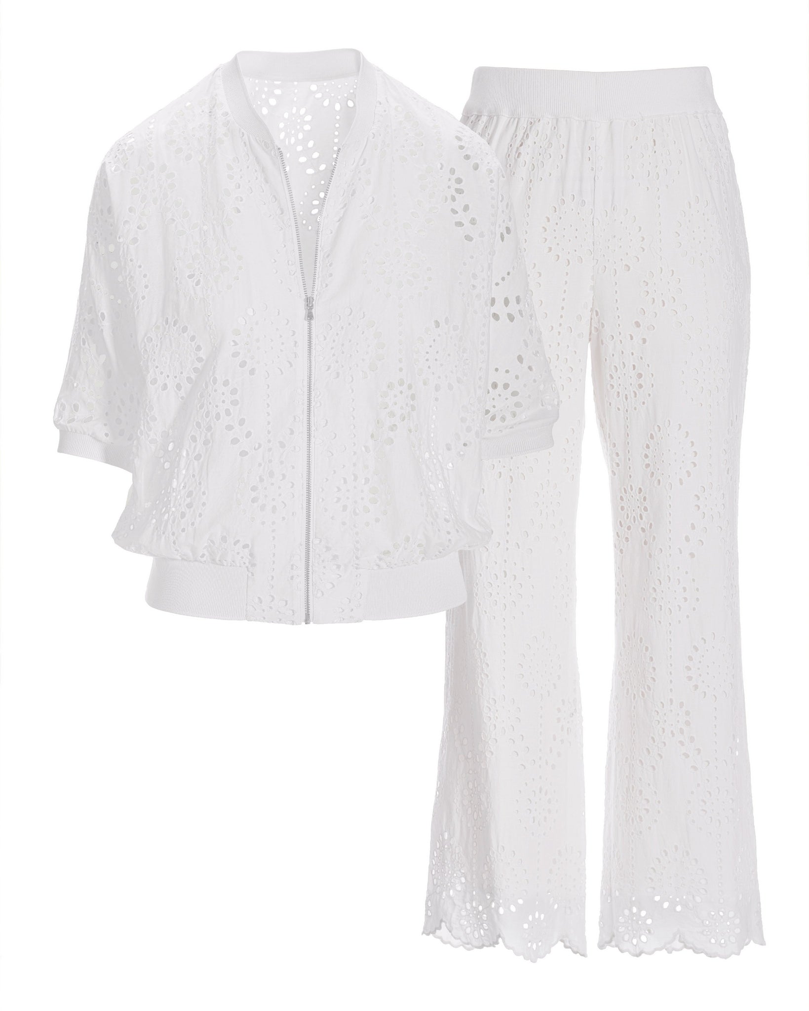 Our matching sport set is a comfy design made chic with allover eyelet lace. A ribbed collar, cuffs, and hem emphasize the casual feel. With a zip-up closure and easy, pull-on pant, this jacket and pant pairing will take you everywhere in style.
