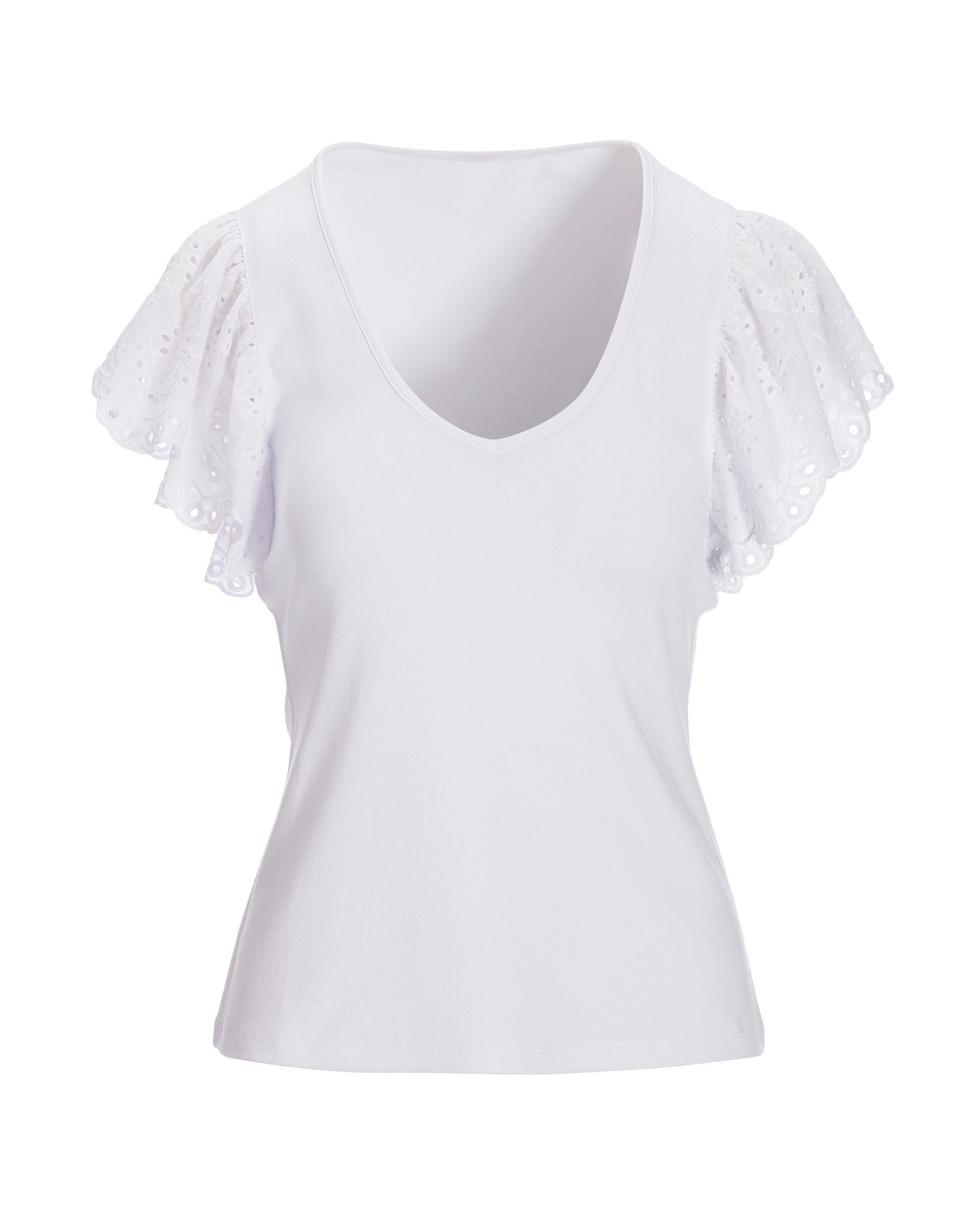 A must-have V-neck knit top is soft and comfortable with eyelet flutter sleeves that add feminine flair to this versatile tee.