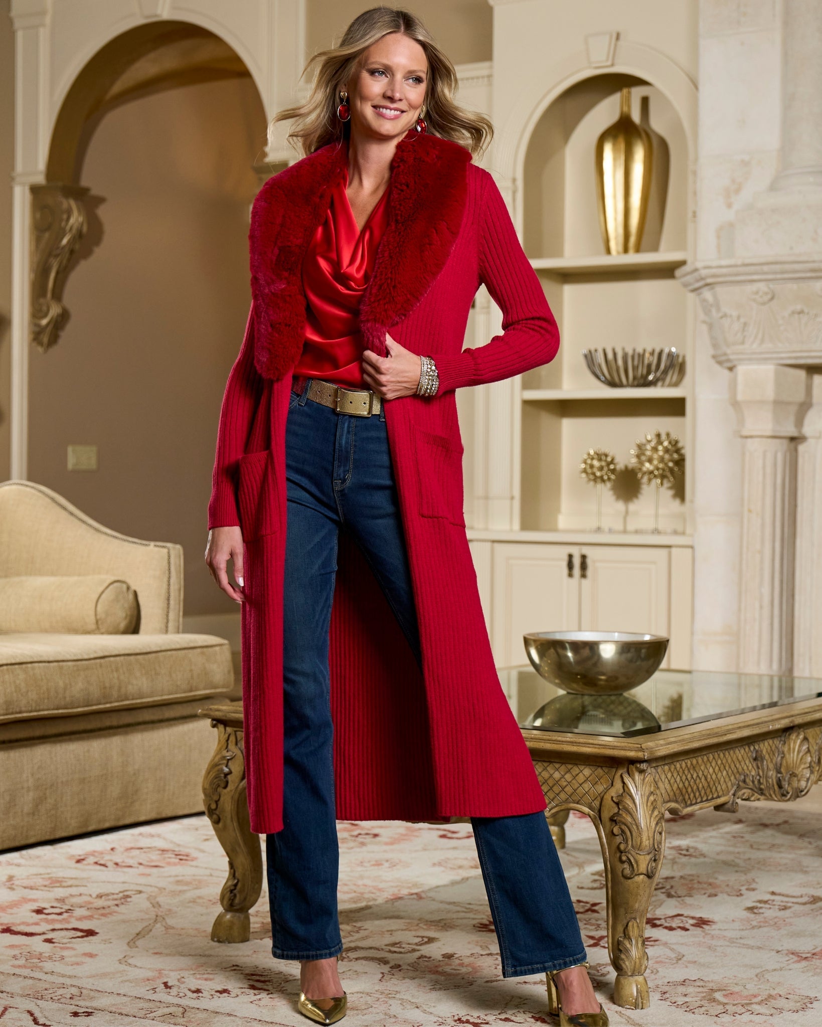 Faux Fur Collar Ribbed Long Cardigan Jester Red