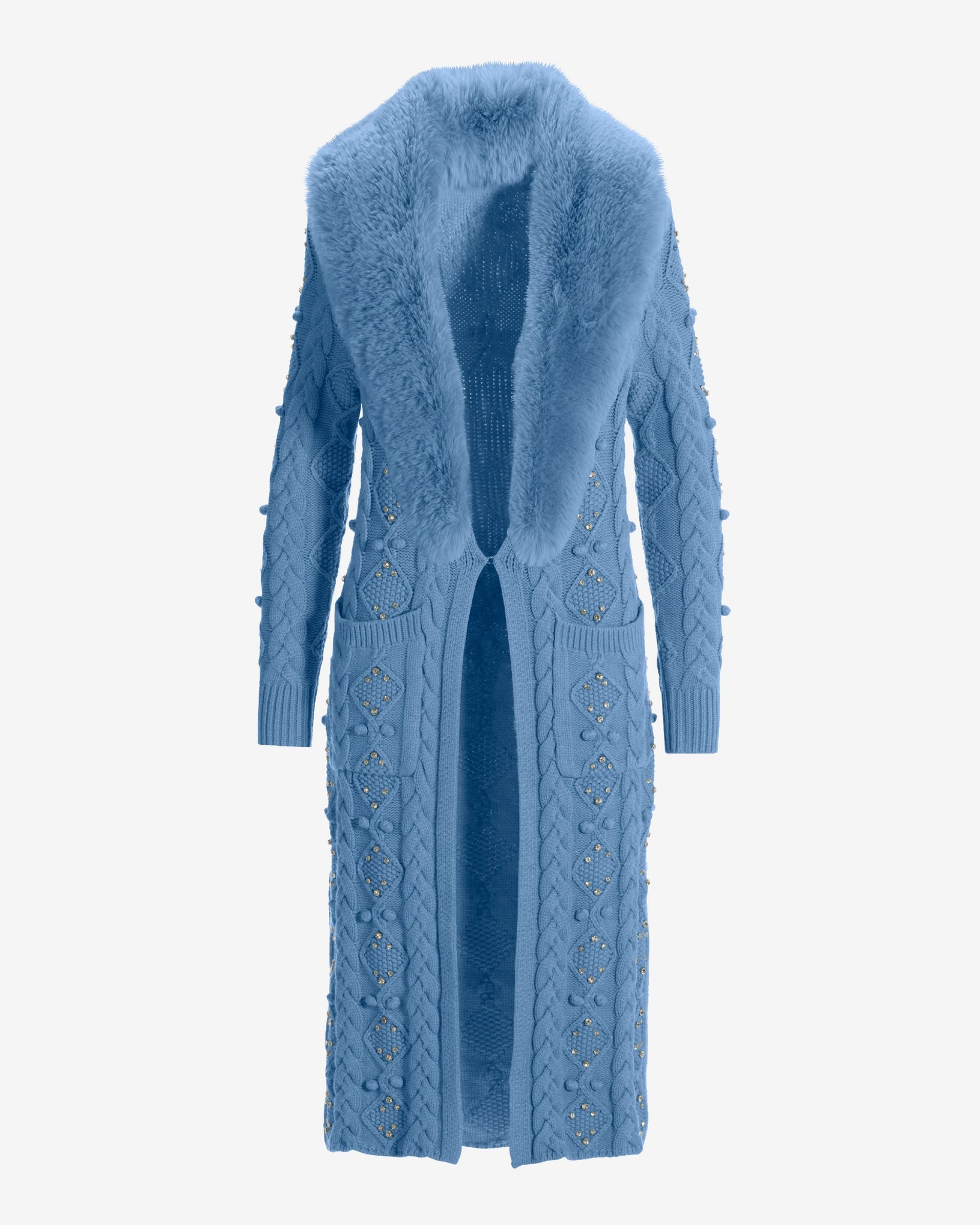 Faux Fur Embellished Cable Duster Clear Blue Sky