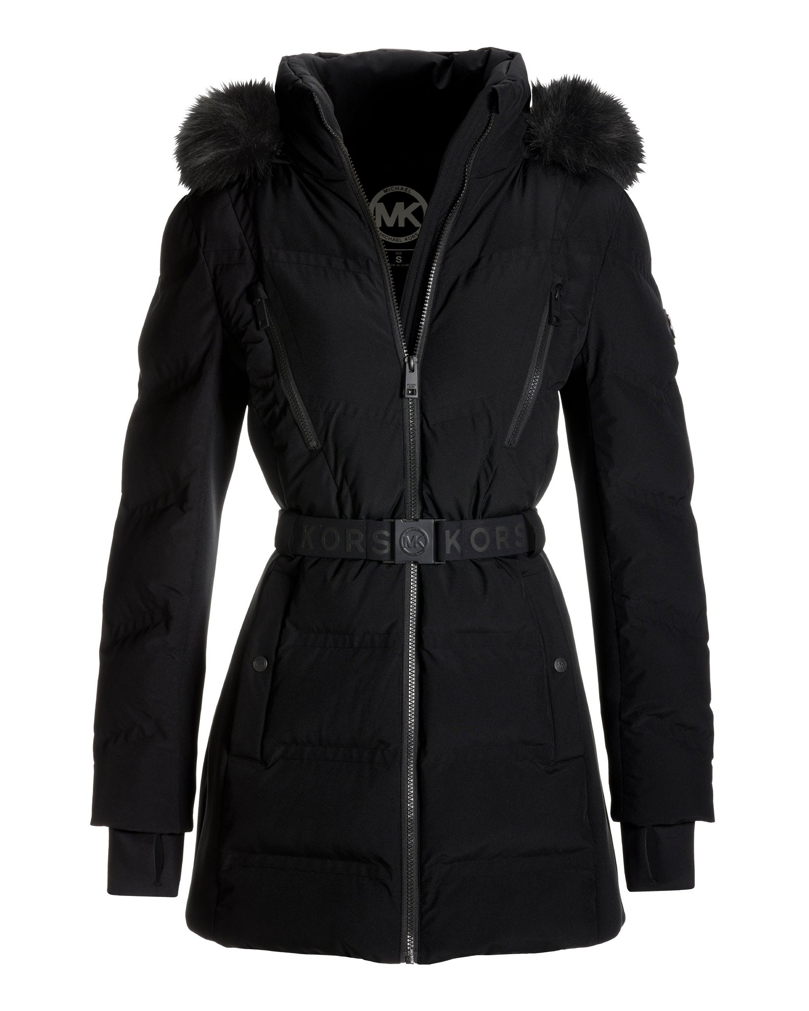 This super-sleek shaped puffer jacket exudes chic style while providing cozy warmth. Quilt stitching, branded hardware and luxe trims offer a sophisticated look with wind-blocking details including thumbhole cuffs, an elastic clip-closure belt and faux-fur trimmed hoodie. It's the season's must-have coat that won't leave you out in the cold.
