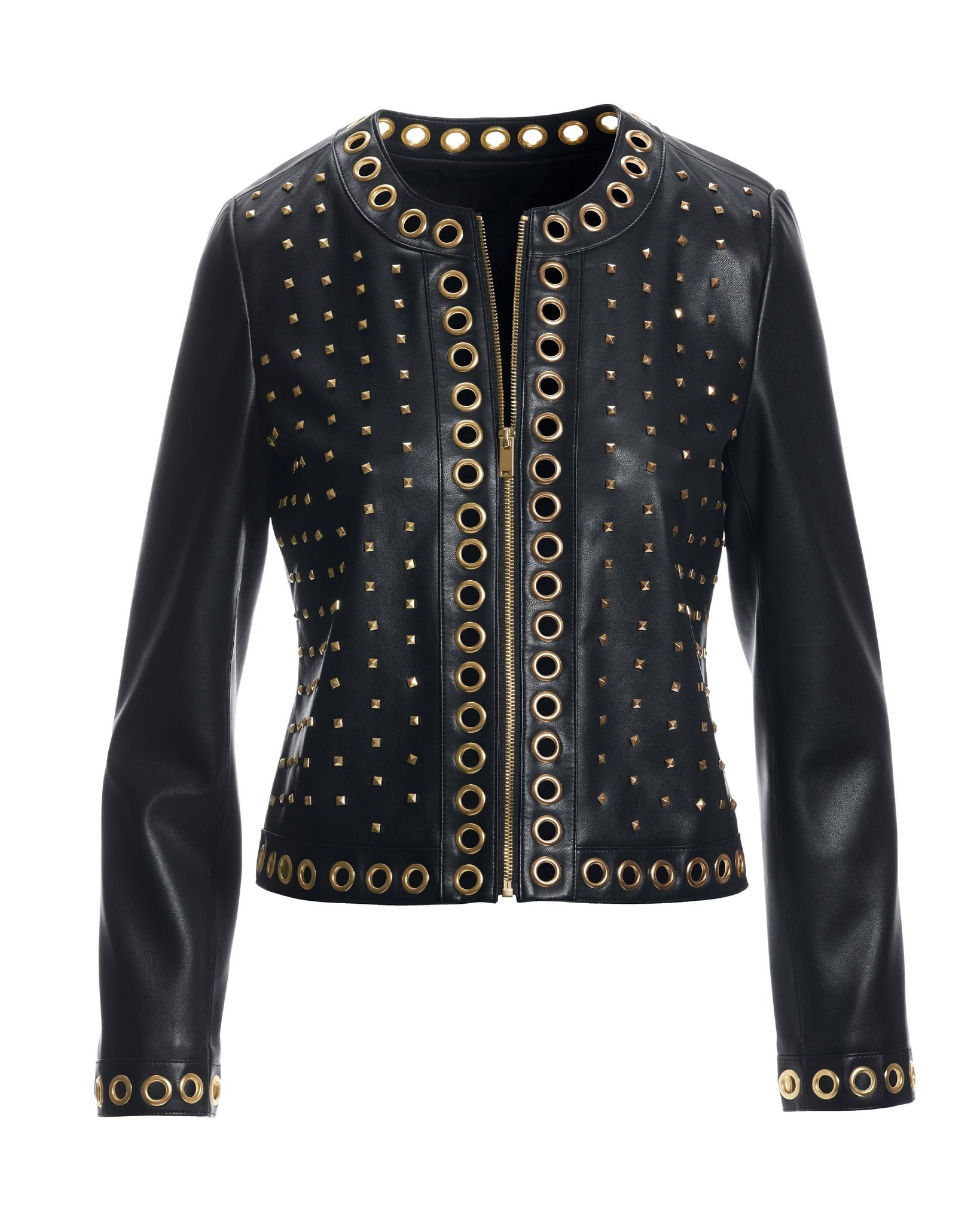 Faux leather collarless jacket gets an edgy biker-chic vibe from gold-tone grommets that accentuate a classic design. Wear solo or layer over your favorite charms and tops for versatile style.