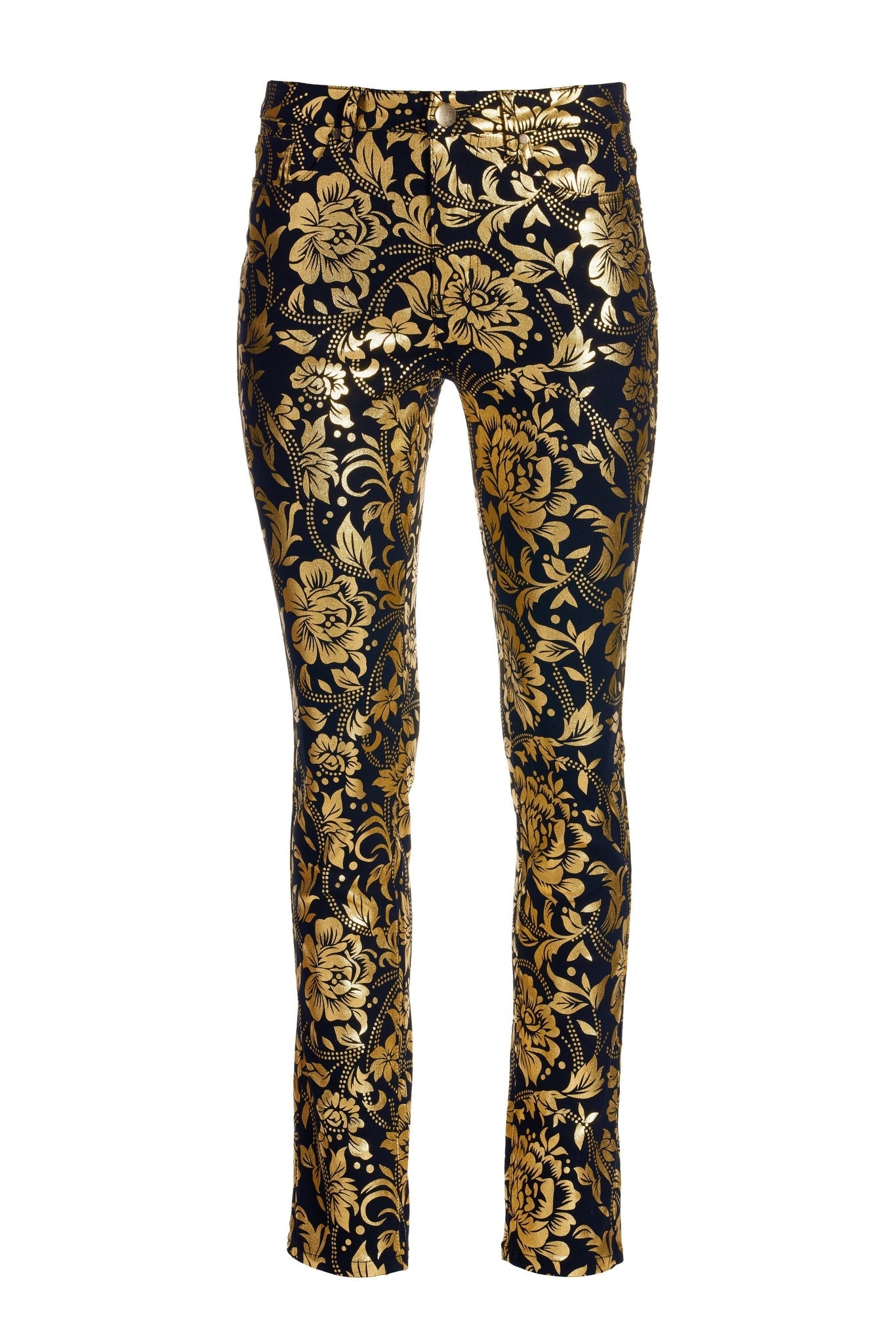 Gold metallic floral brocade infuses luxurious style so you can create glam looks this party season when you pair this easy stretch jean with everything from dressy tops to casual tees and jackets. Length measures to the ankle with a 29-inch inseam.