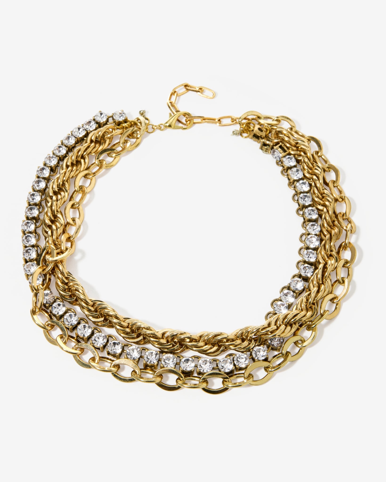 An eye-catching arrangement featuring layers of gold-tone rope, chain links, and crystals forms our Gold Layered Rope Crystal Chain. Perfect for adding a bold touch to all your outfits now and in seasons to come.