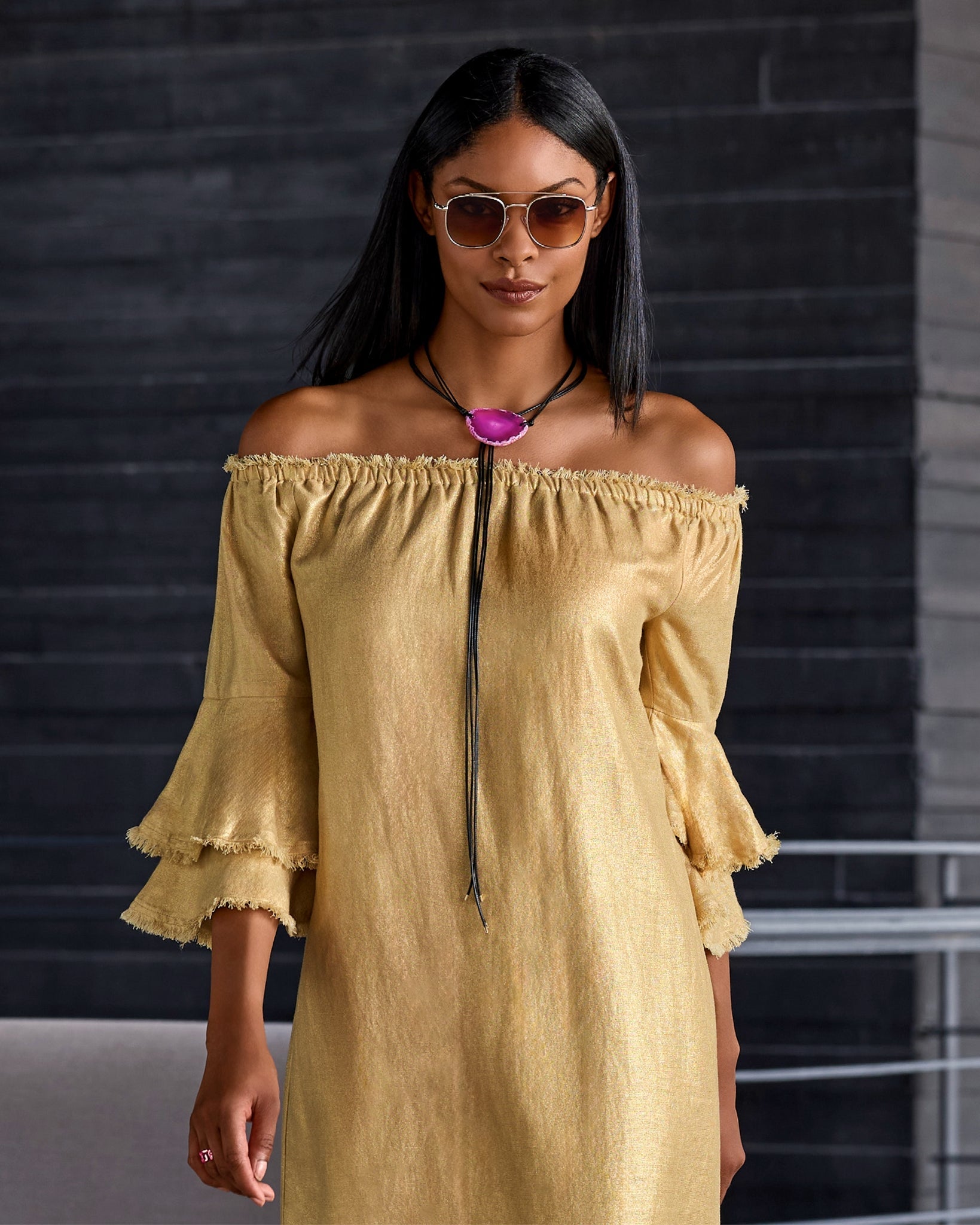 Our Gold Trim Tie Around Necklace elevates your look with effortless boho-chic appeal. Featuring a stone centerpiece, polished metal accents, and long leather tassels, each piece is uniquely crafted to add free-spirited style to any outfit.