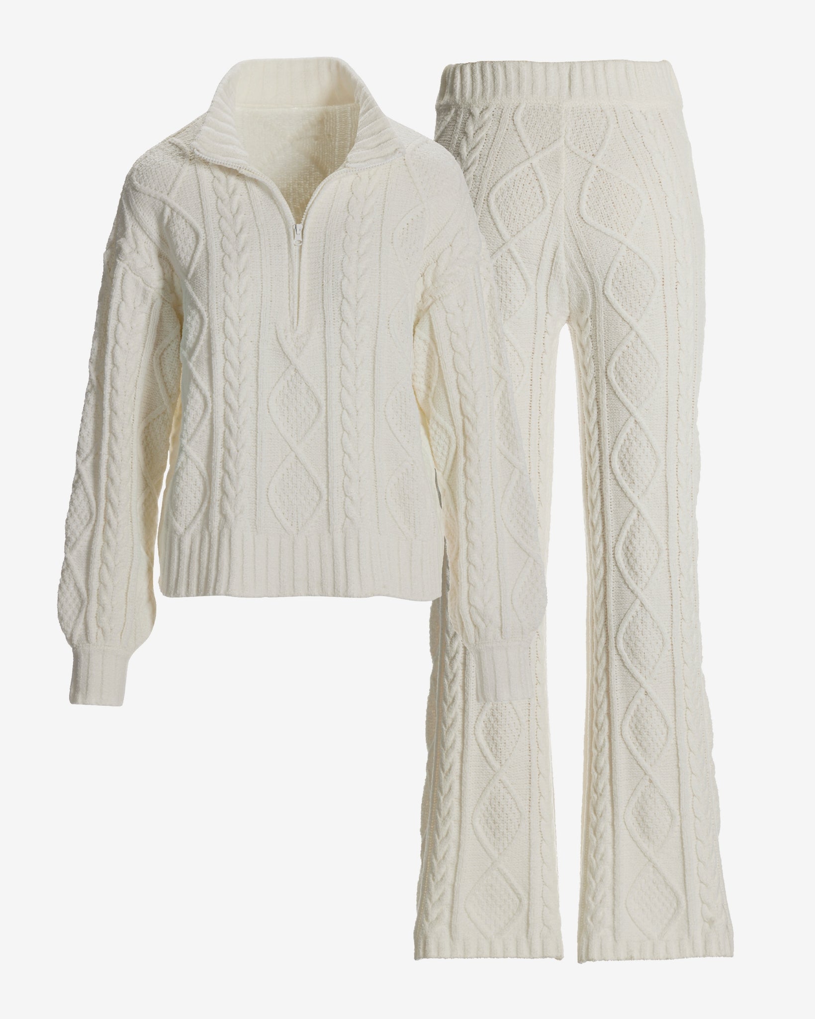 Luxuriate in the cozy comfort of our Half Zip Cable Lounge Set, featuring an ultra-soft cable-knit top with a partial zip closure and matching pull-on lounge pants. A stylish go-to for relaxing indoors or venturing out into the cold.