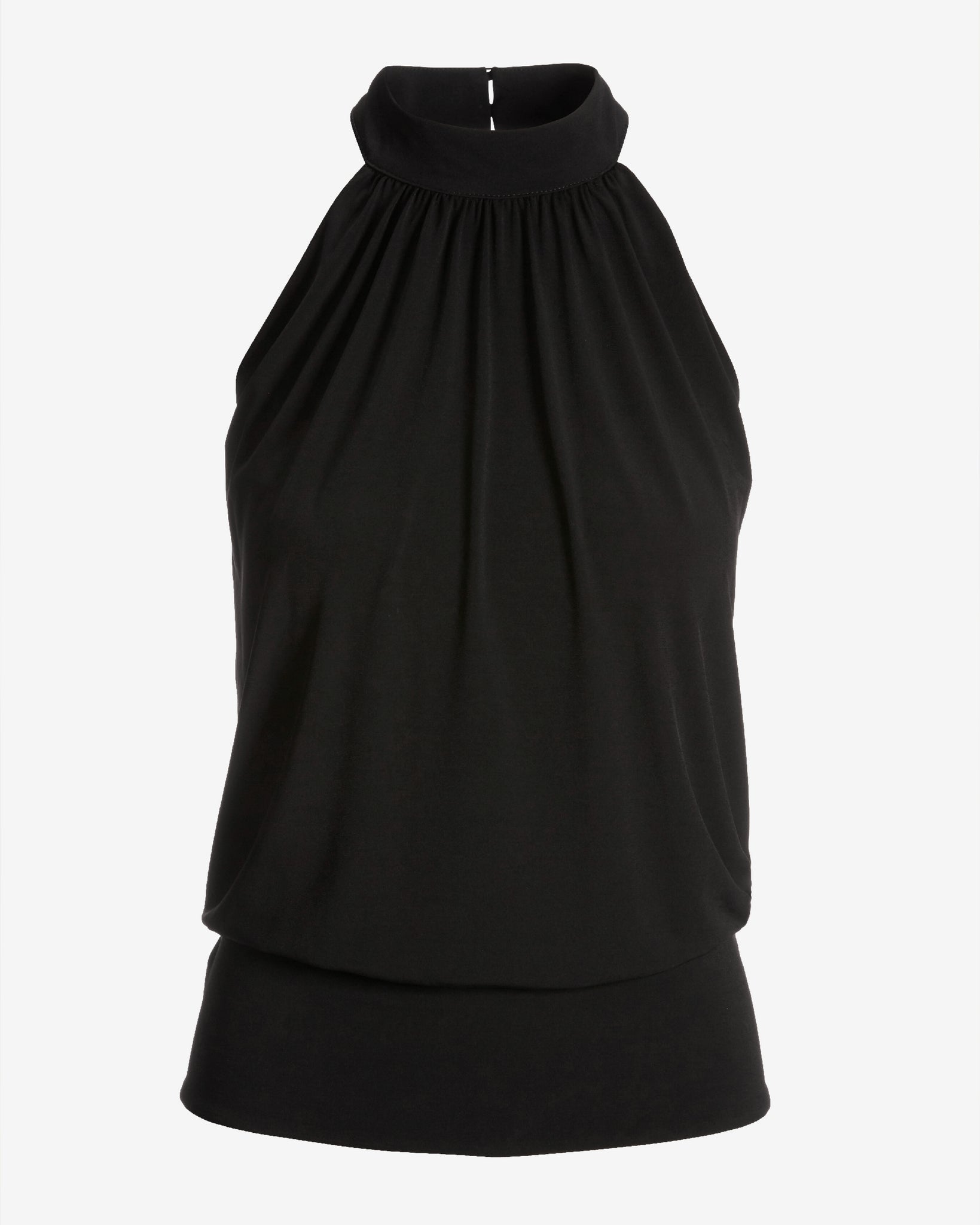 The most flattering top features a comfortable two-ply knit design with a mock neckline, a banded blouson hem and strappy open back details.