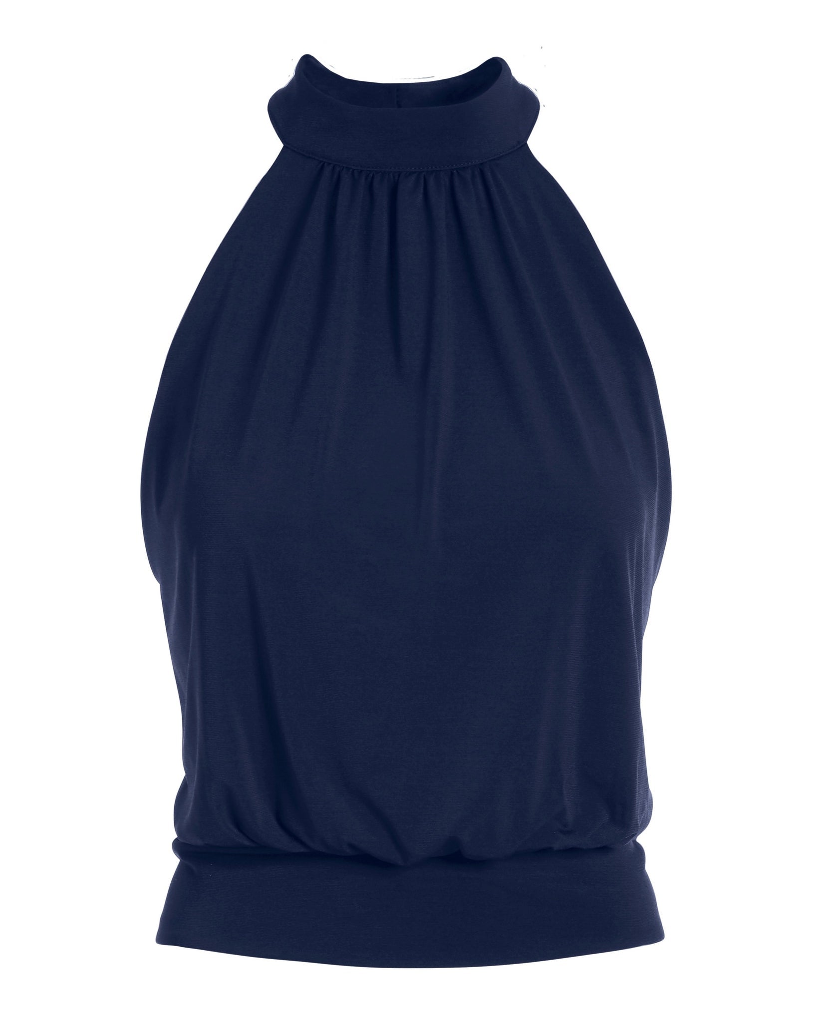 The most flattering top features a comfortable two-ply knit design with a mock neckline, a banded blouson hem and strappy open back details.