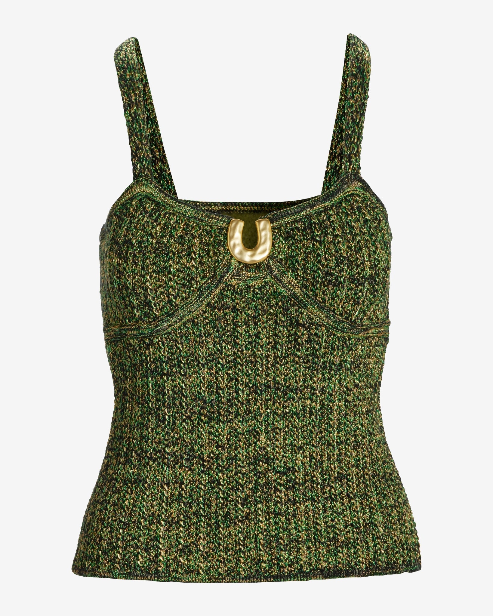 Designed to go beyond the basics, the Hardware Marled Sweater Tank adds a refined touch to your warm-weather wardrobe. Knit from a textured marled yarn, this fitted tank features a rounded neckline accented by a gold horseshoe hardware detail—giving it just the right amount of shine. It’s a versatile piece you’ll wear solo or layered, dressed up or down.