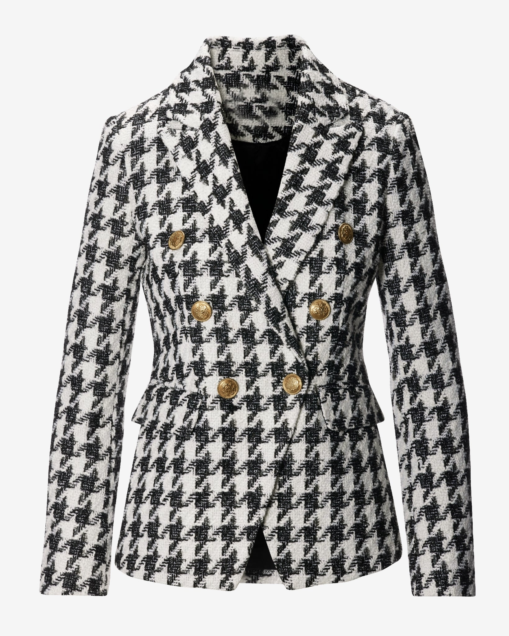 Our Houndstooth Double Breasted Blazer elevates a classic, two-toned textile pattern to add visual interest to casual and dressier looks. Accented with metallic threading and gold-tone crested buttons, it exudes sheer elegance while effortlessly complementing all your favorite bottoms.