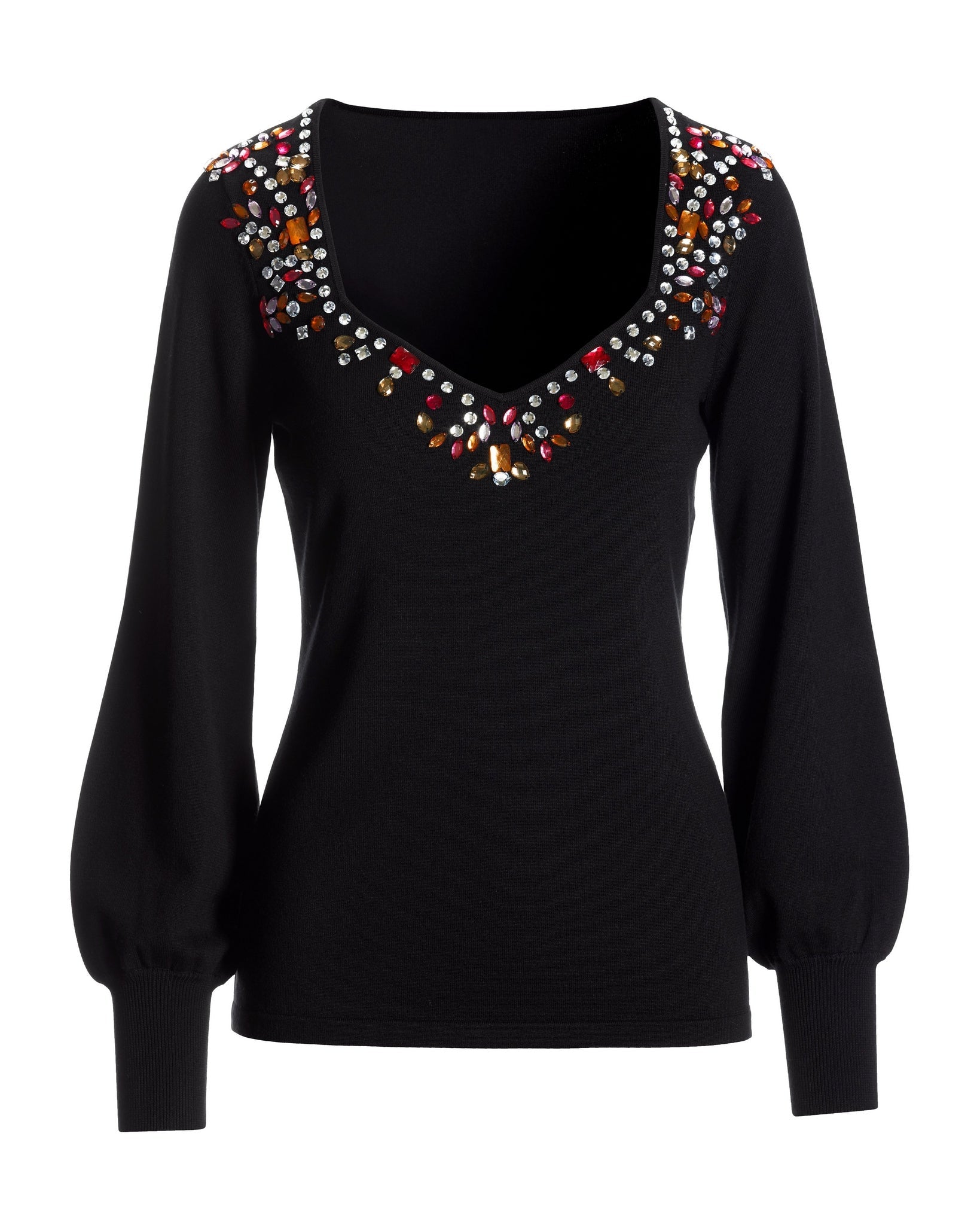 Indulge in luxury as shimmering jewels adorn the neckline of this flattering sweater, creating a captivating and glamorous look. Crafted with attention to detail, this sweater combines comfort and elegance effortlessly. Elevate any outfit and let your style shine.