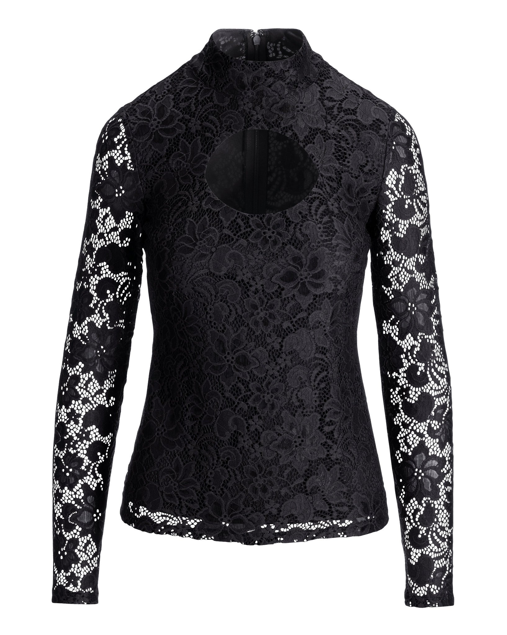 This black lace top combines feminine details and a peekaboo cutout neckline for an alluring night out look. Perfect for party season and beyond, this knit turtleneck top is the epitome of sexy-chic style.