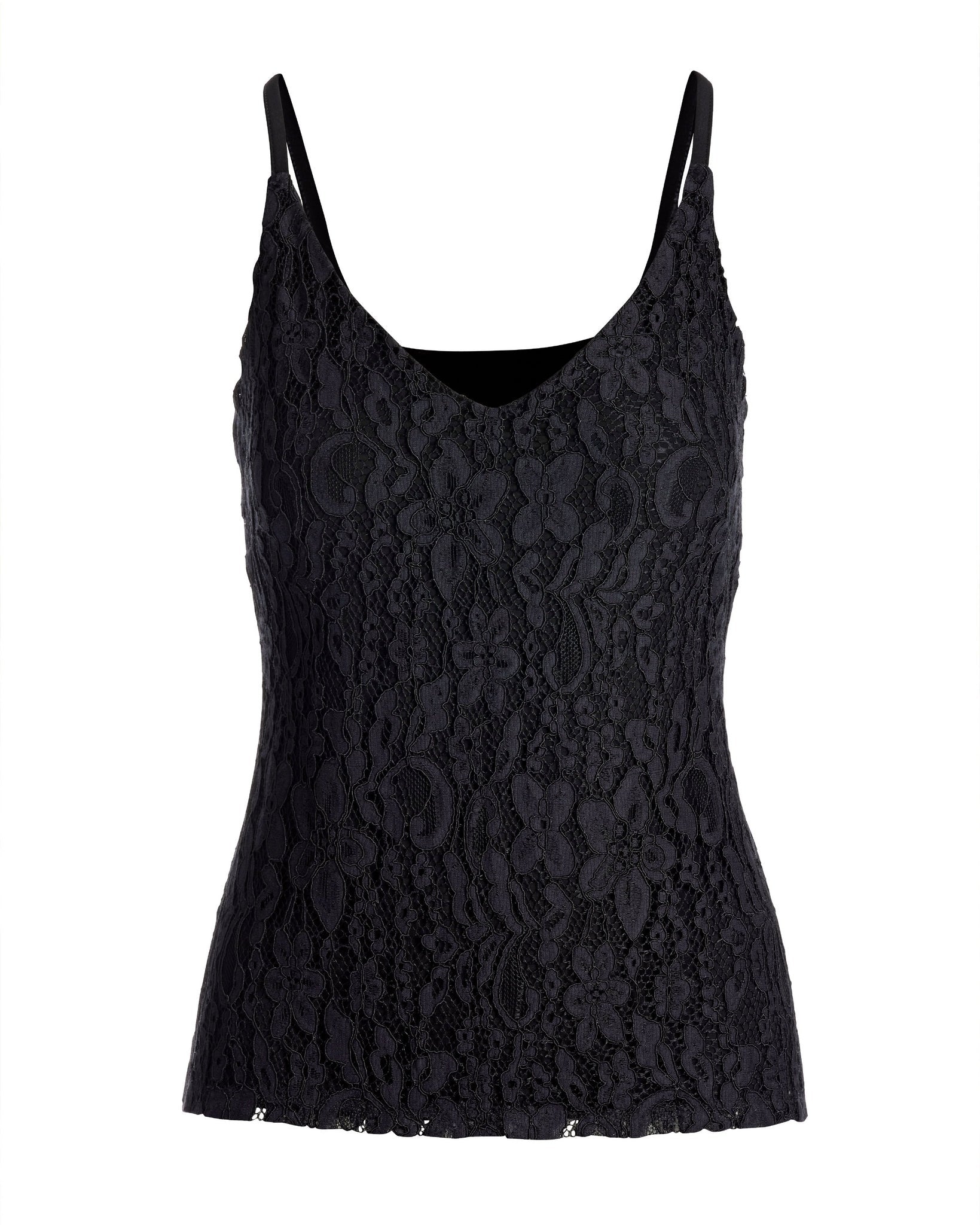 A feminine lace front adds texture and style to a basic V-neck cami top that's anything but when paired with luxe jackets or casual denim jackets.