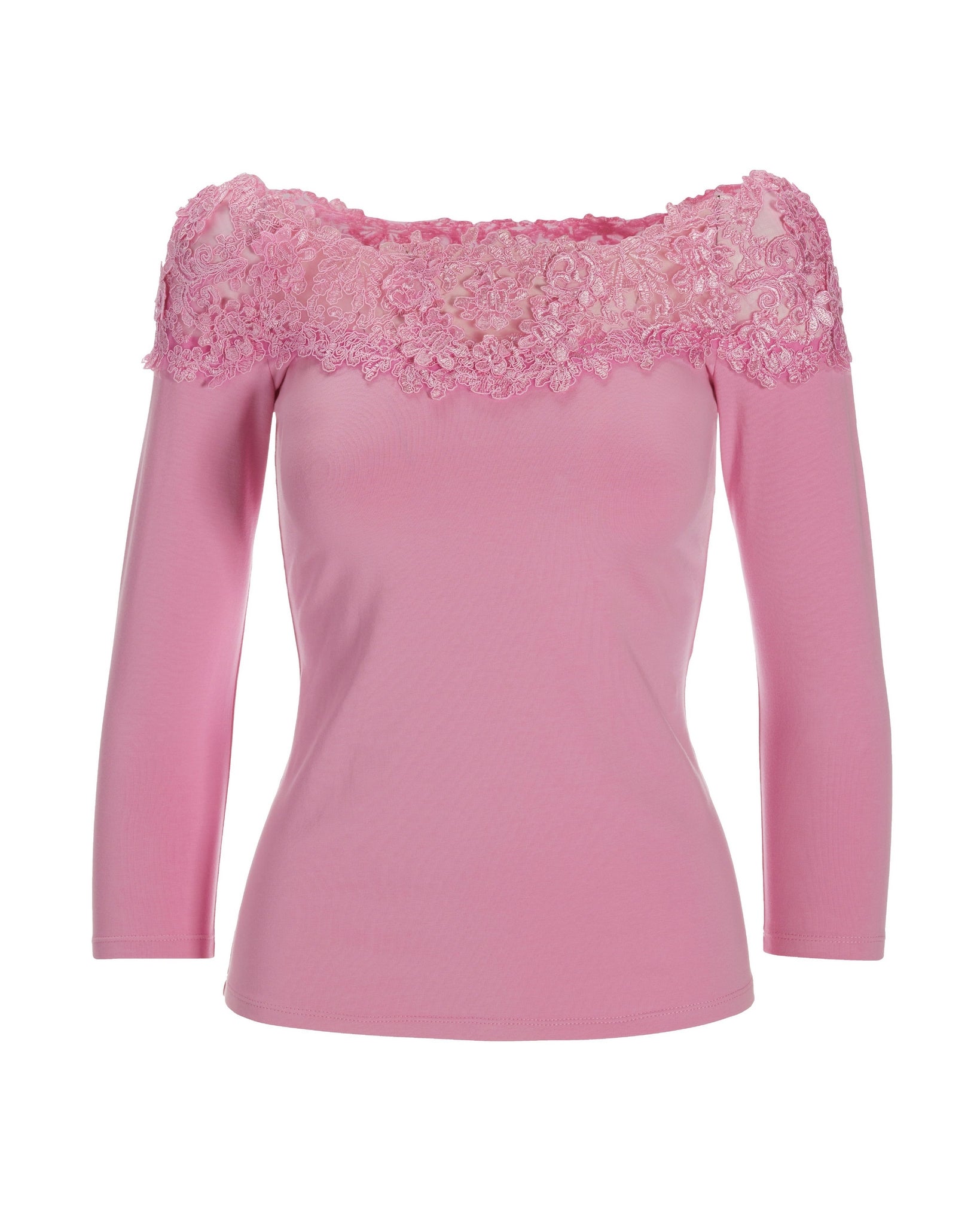 Undeniably feminine and comfortable, this lace illusion knit top alludes to sexy off-the-shoulder styling, making any outfit irresistibly alluring. It's the perfect look to dress up a jean for date night and pair with a dressy pant for cocktails.