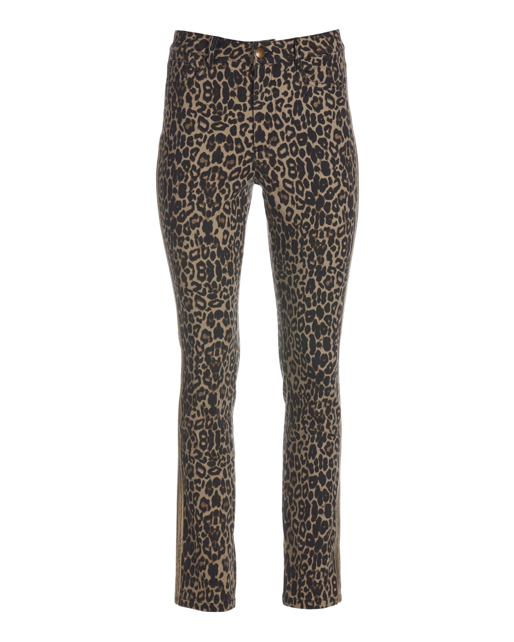 Give your classic denim a break while you slip into this edgy leopard print straight-leg jean. The slim silhouette flatters while the metallic racer stripes add a luxe touch to this easy stretch jean. Length measures to the ankle with a 29 inch inseam.