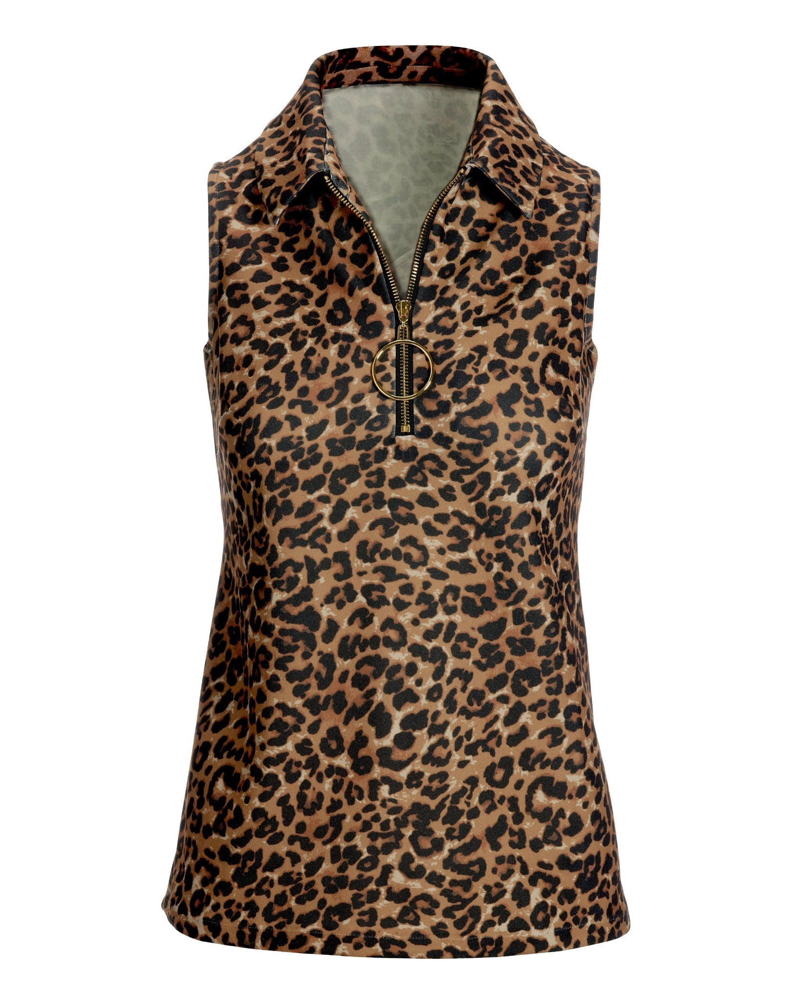 Be bold in alluring leopard print style with a partial zipper closure and pointed collar topping this comfortable sleeveless knit top.