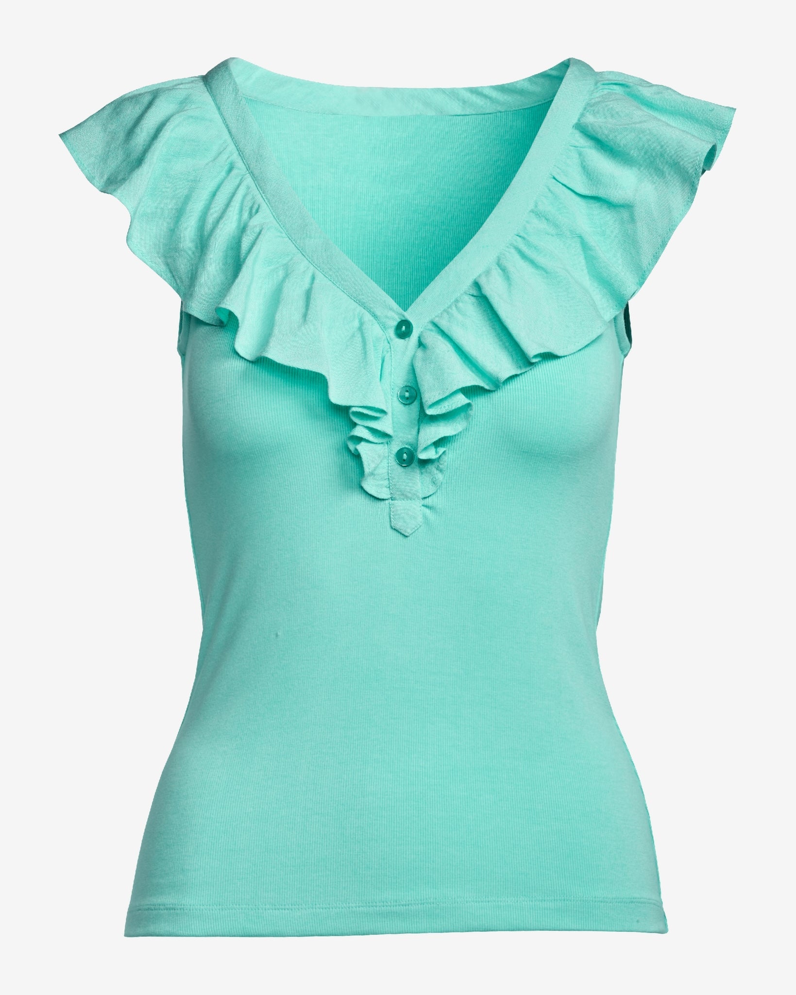 Linen Ruffle Henley Ribbed Top Aqua Splash