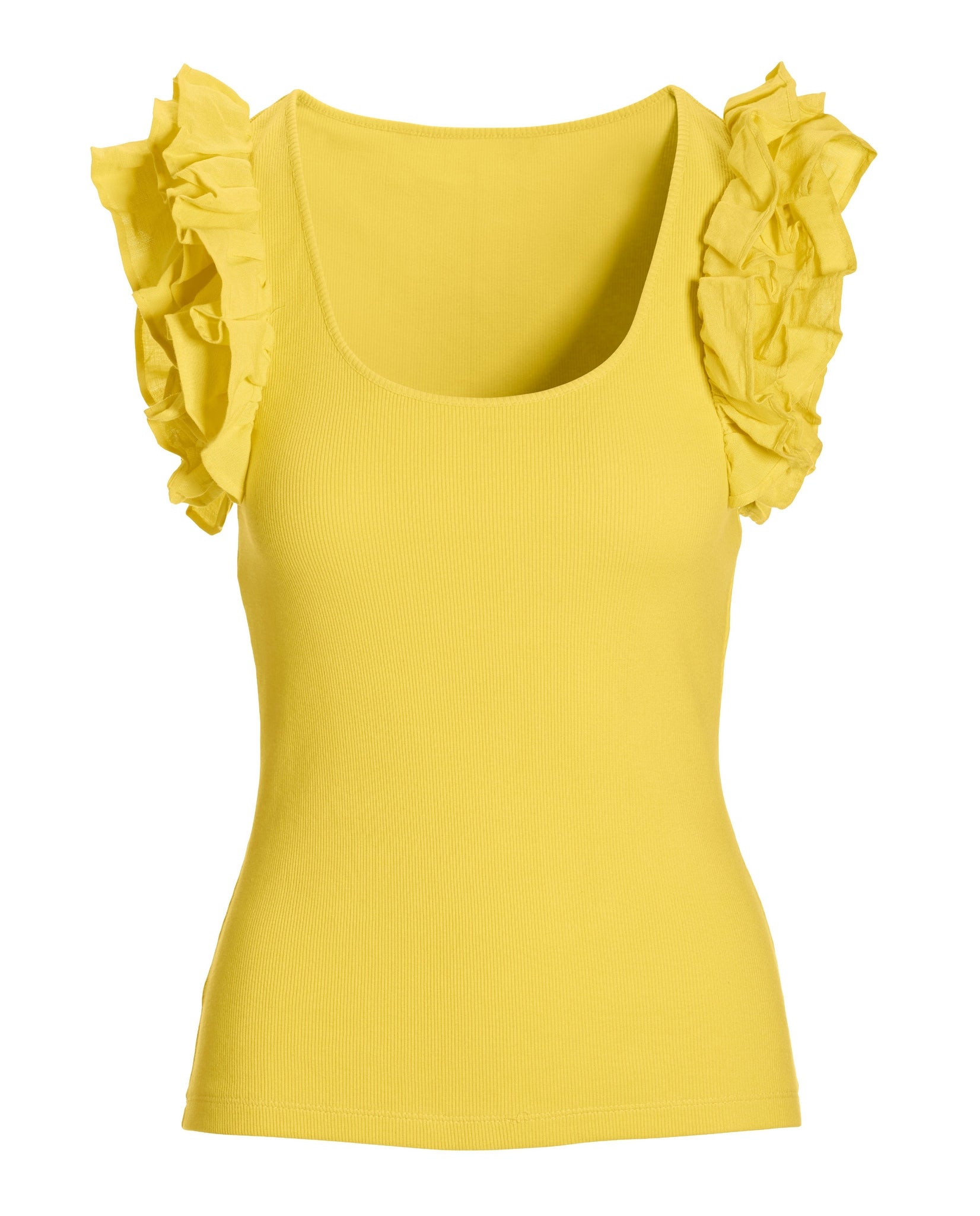 Layered linen ruffles frame the most comfortable ribbed knit scoop-neck top to create effortless feminine looks when paired with flattering bottoms and classic denim jeans.
